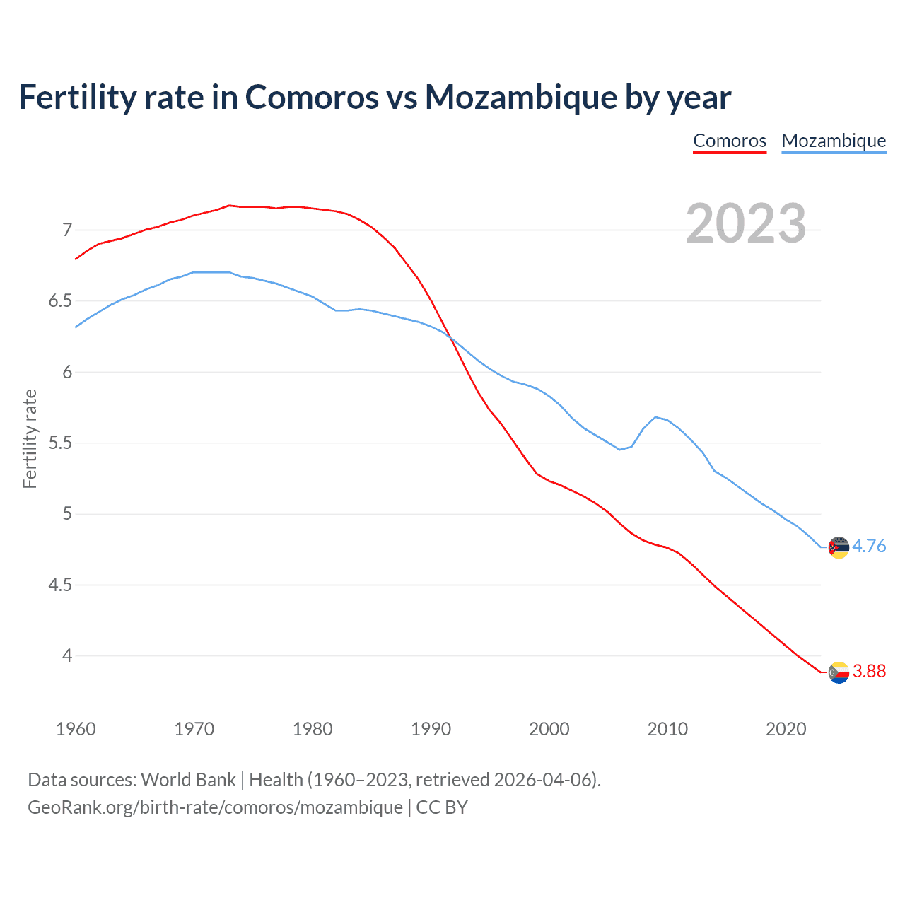 1960 vs 2023, the fertility rate has decreased by 42.9% in Comoros and by 24.5% in Mozambique — in 1960, it was 6.79 and 6.31, respectively.