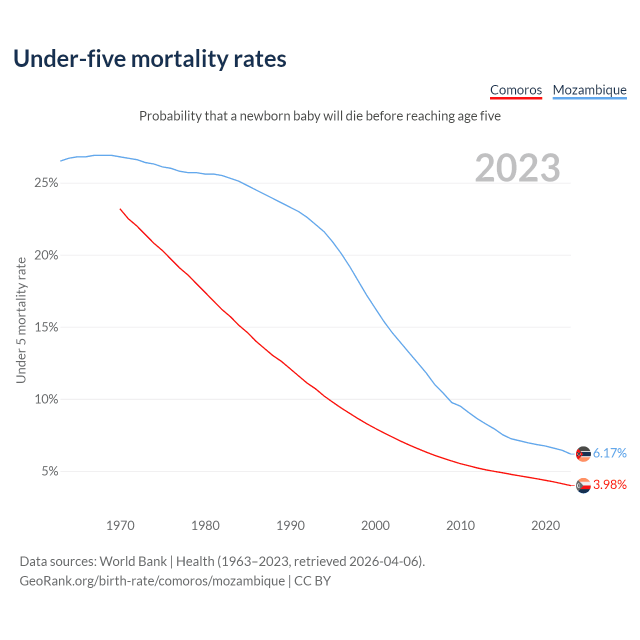 The chance that a newborn baby will die before reaching age five is 3.98% in Comoros and 6.17% in Mozambique. Above is a chart with historical data on under-five mortality rates.