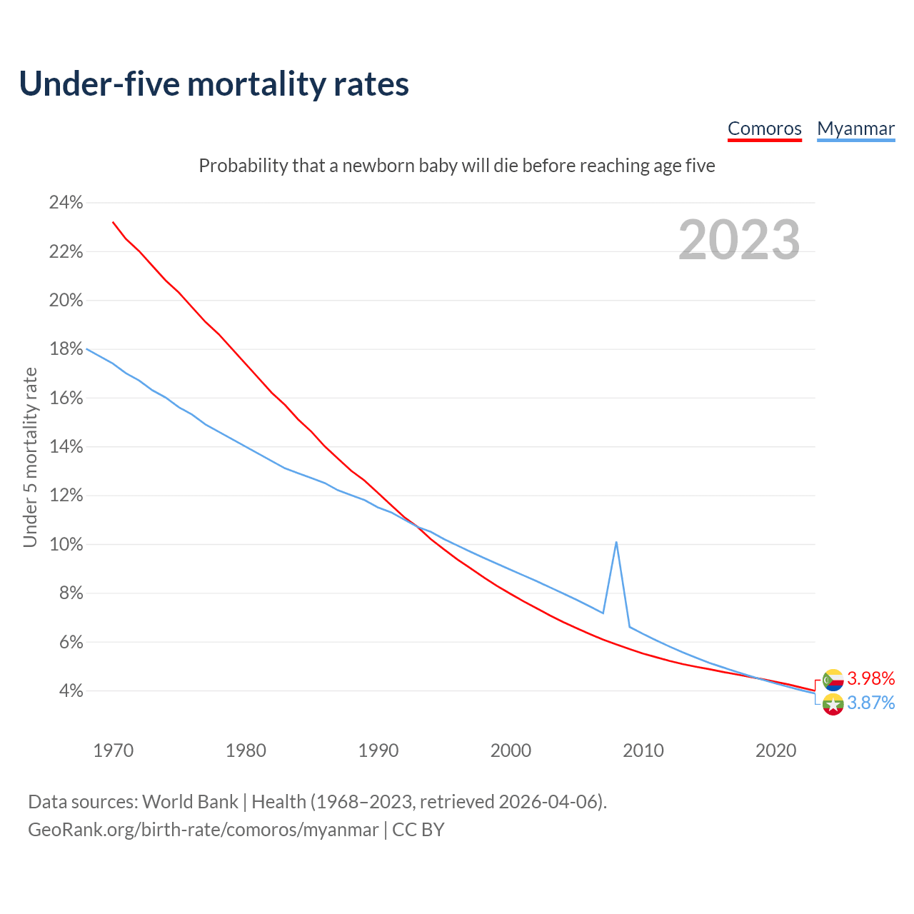 The chance that a newborn baby will die before reaching age five is 3.98% in Comoros and 3.87% in Myanmar. Above is a chart with historical data on under-five mortality rates.