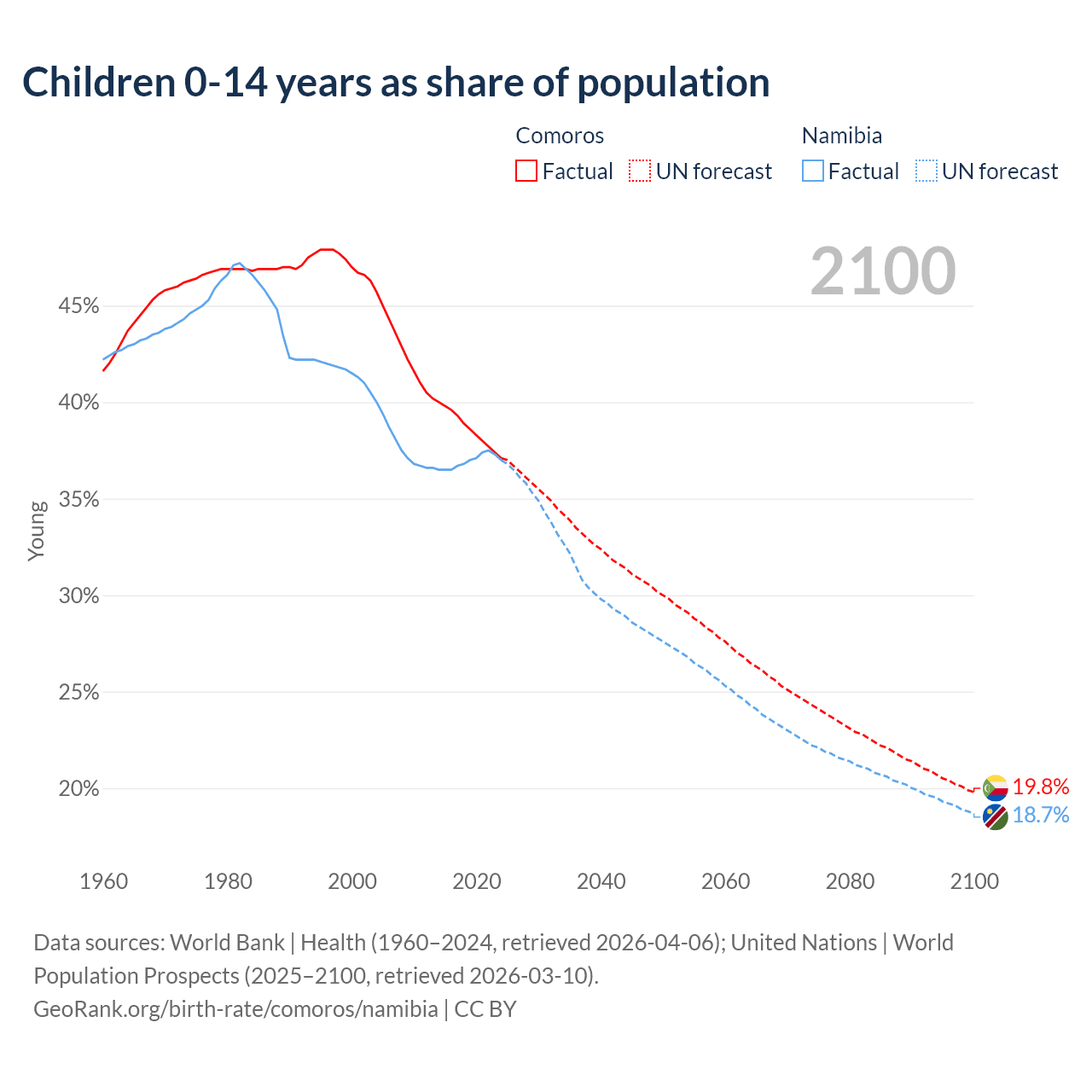 According to the latest available data on birth rates, the fertility rate in Comoros was 3.88 children per woman in 2023, compared to 3.21 in Namibia in 2023. The replacement level is considered to be 2.1 children per woman.