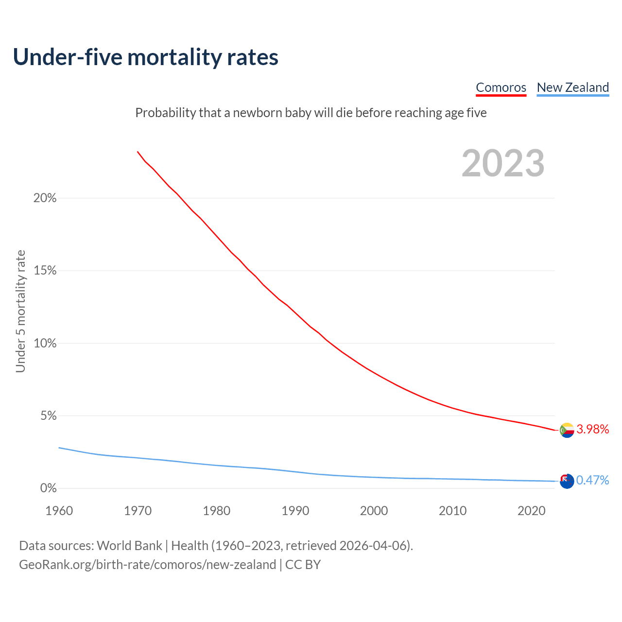 The chance that a newborn baby will die before reaching age five is 3.98% in Comoros and 0.47% in New Zealand. Above is a chart with historical data on under-five mortality rates.