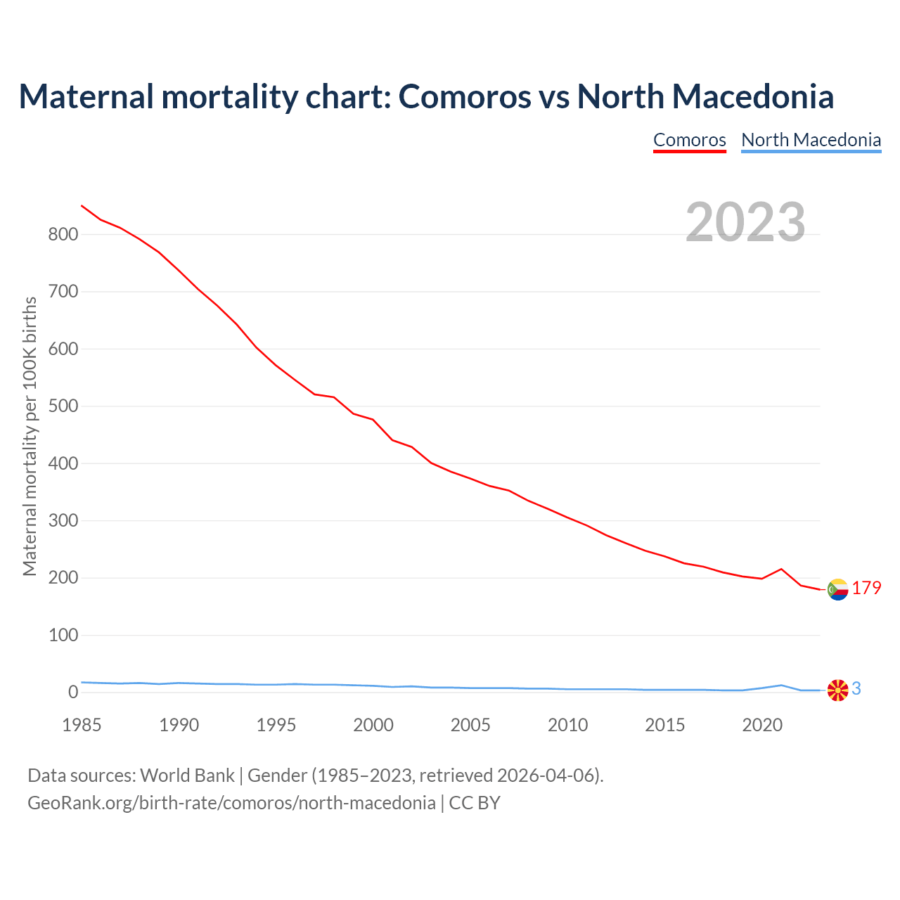 The maternal mortality rate, which is the probability of dying during childbirth or within 42 days of pregnancy termination, is 179 deaths per 100,000 live births in Comoros, compared to 3 deaths in North Macedonia.