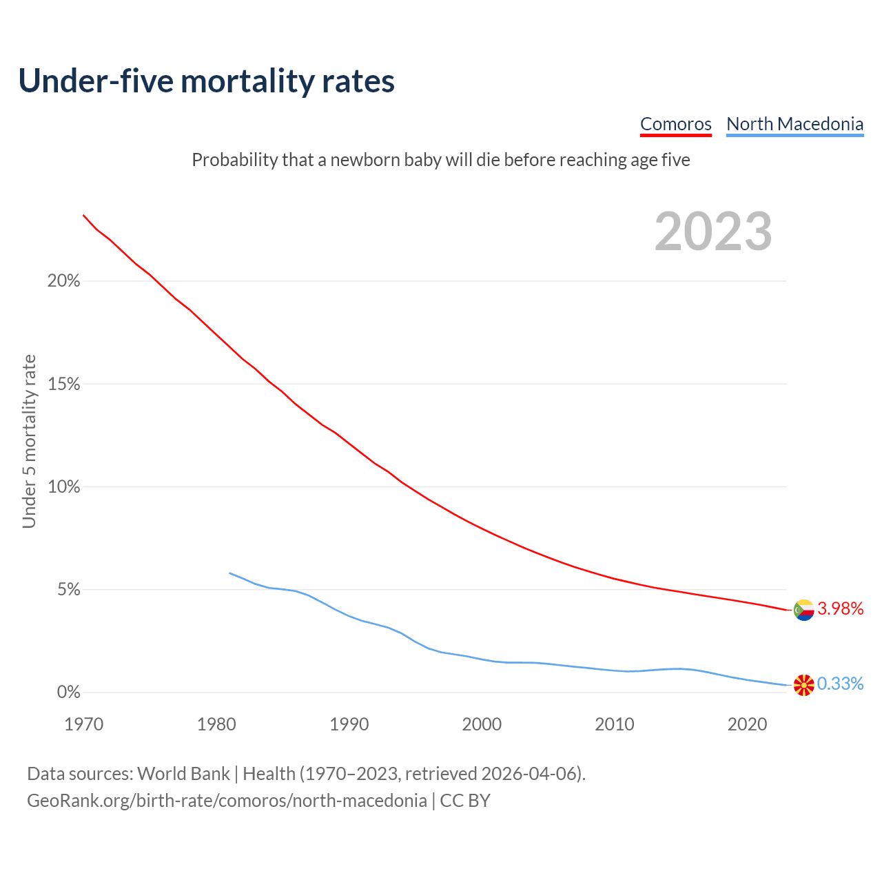 The chance that a newborn baby will die before reaching age five is 3.98% in Comoros and 0.33% in North Macedonia. Above is a chart with historical data on under-five mortality rates.