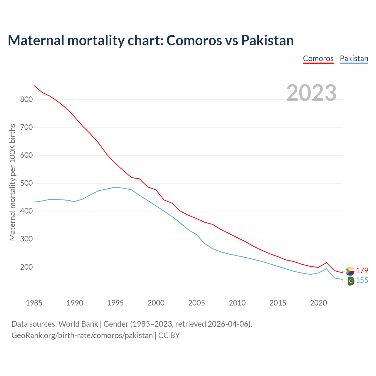 The maternal mortality rate, which is the probability of dying during childbirth or within 42 days of pregnancy termination, is 179 deaths per 100,000 live births in Comoros, compared to 155 deaths in Pakistan.