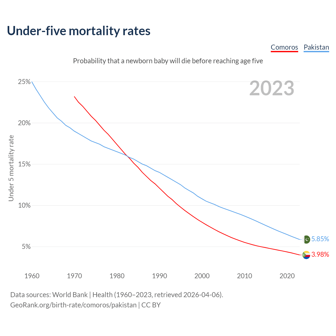 The chance that a newborn baby will die before reaching age five is 3.98% in Comoros and 5.85% in Pakistan. Above is a chart with historical data on under-five mortality rates.