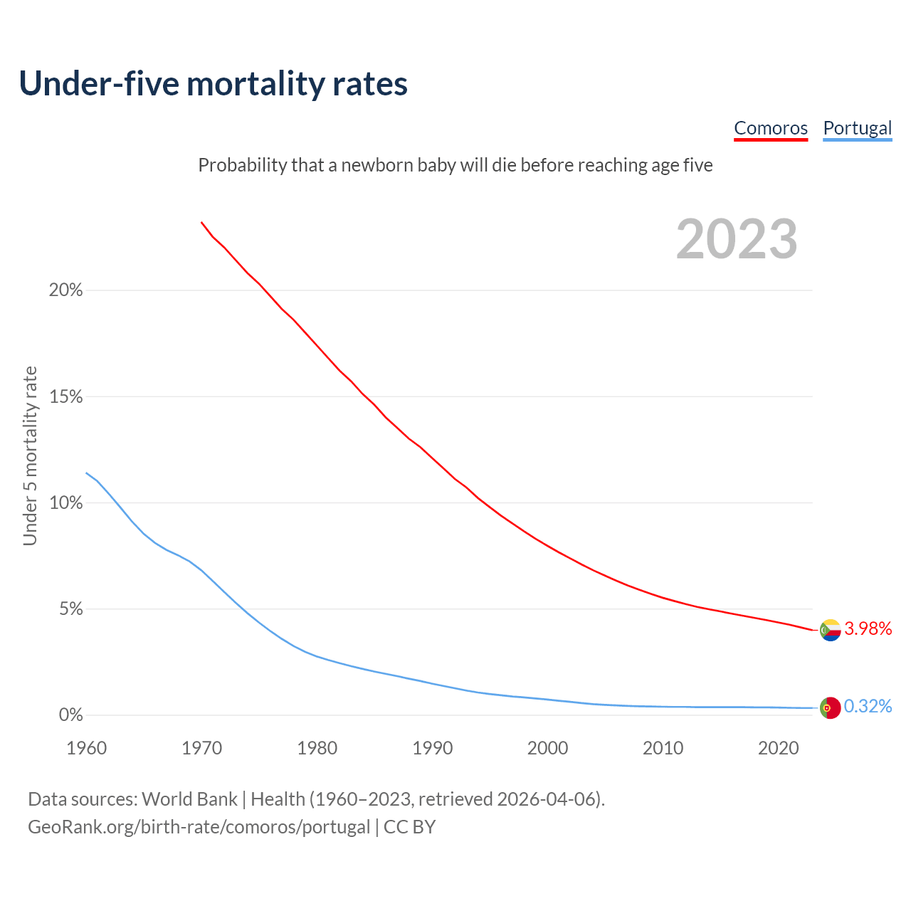 The chance that a newborn baby will die before reaching age five is 3.98% in Comoros and 0.32% in Portugal. Above is a chart with historical data on under-five mortality rates.