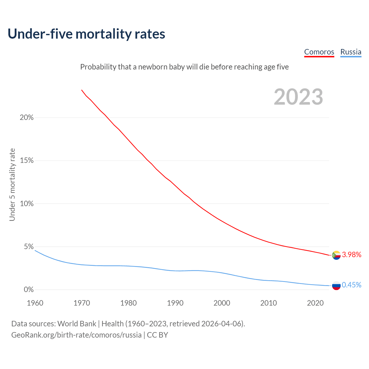 The chance that a newborn baby will die before reaching age five is 3.98% in Comoros and 0.45% in Russia. Above is a chart with historical data on under-five mortality rates.