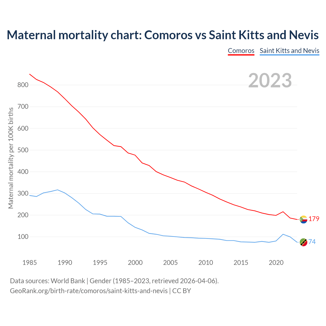 The maternal mortality rate, which is the probability of dying during childbirth or within 42 days of pregnancy termination, is 179 deaths per 100,000 live births in Comoros, compared to 74 deaths in Saint Kitts and Nevis.