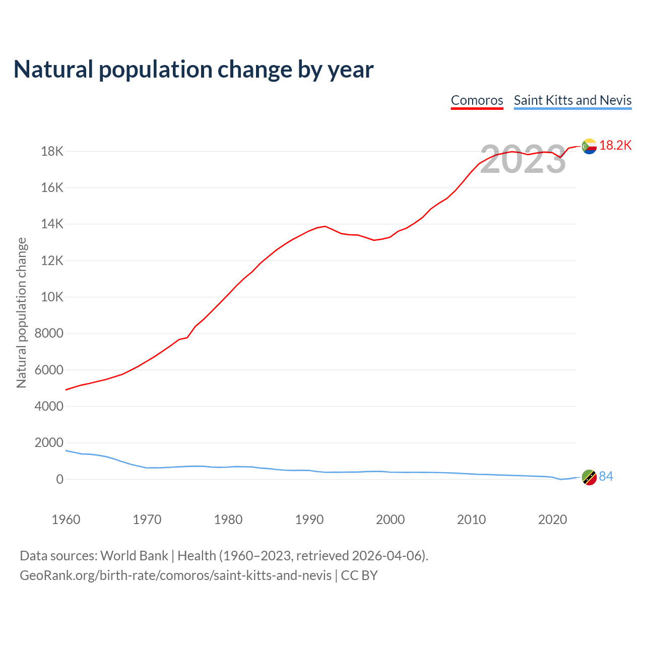 Comoros has an annual birth rate of 28.7 births per 1,000 people, compared to 11.7 for Saint Kitts and Nevis. The average number of children a woman is expected to have during her lifetime — the fertility rate, is 3.88 in Comoros and 1.51 in Saint Kitts and Nevis — 61.2% difference.