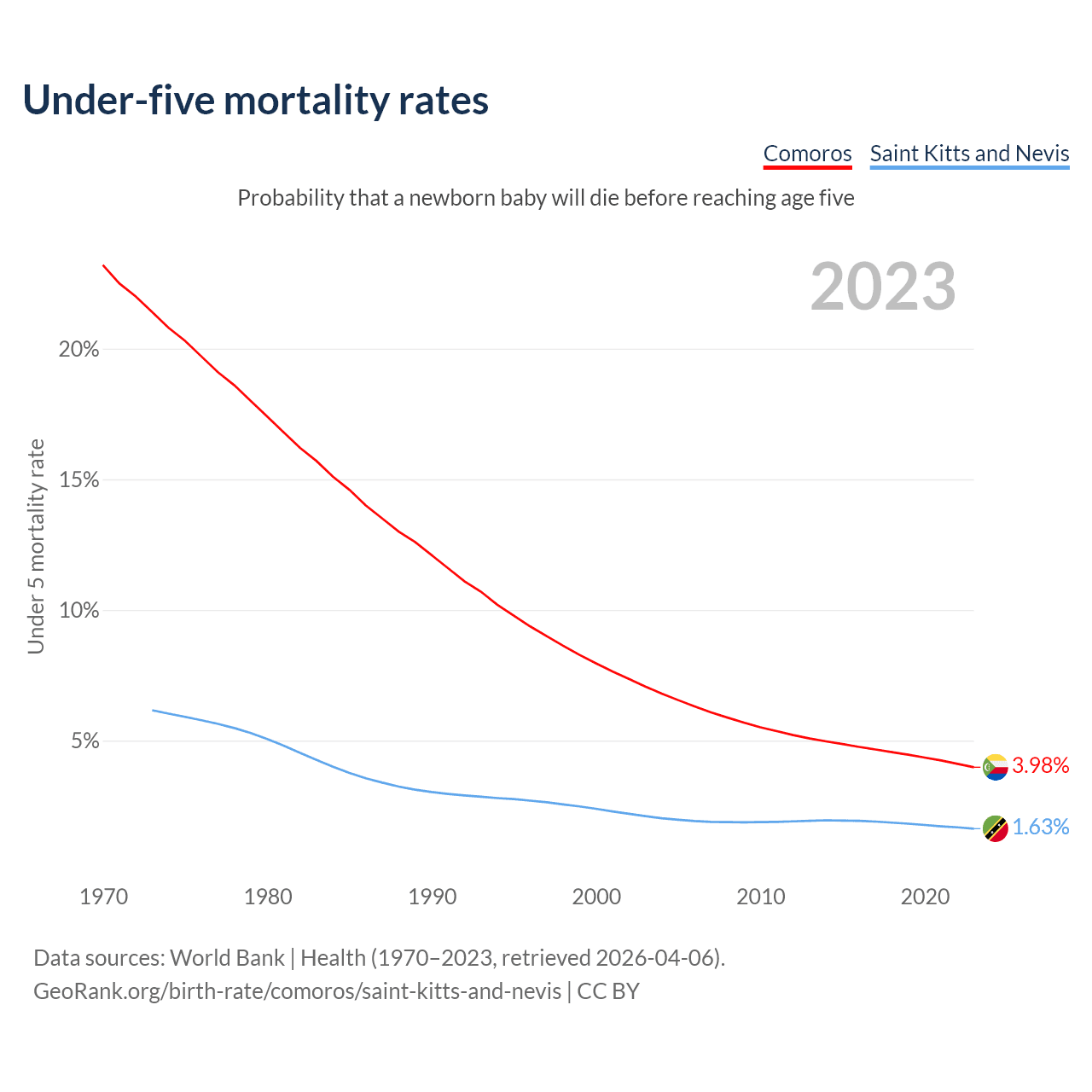 The chance that a newborn baby will die before reaching age five is 3.98% in Comoros and 1.63% in Saint Kitts and Nevis. Above is a chart with historical data on under-five mortality rates.