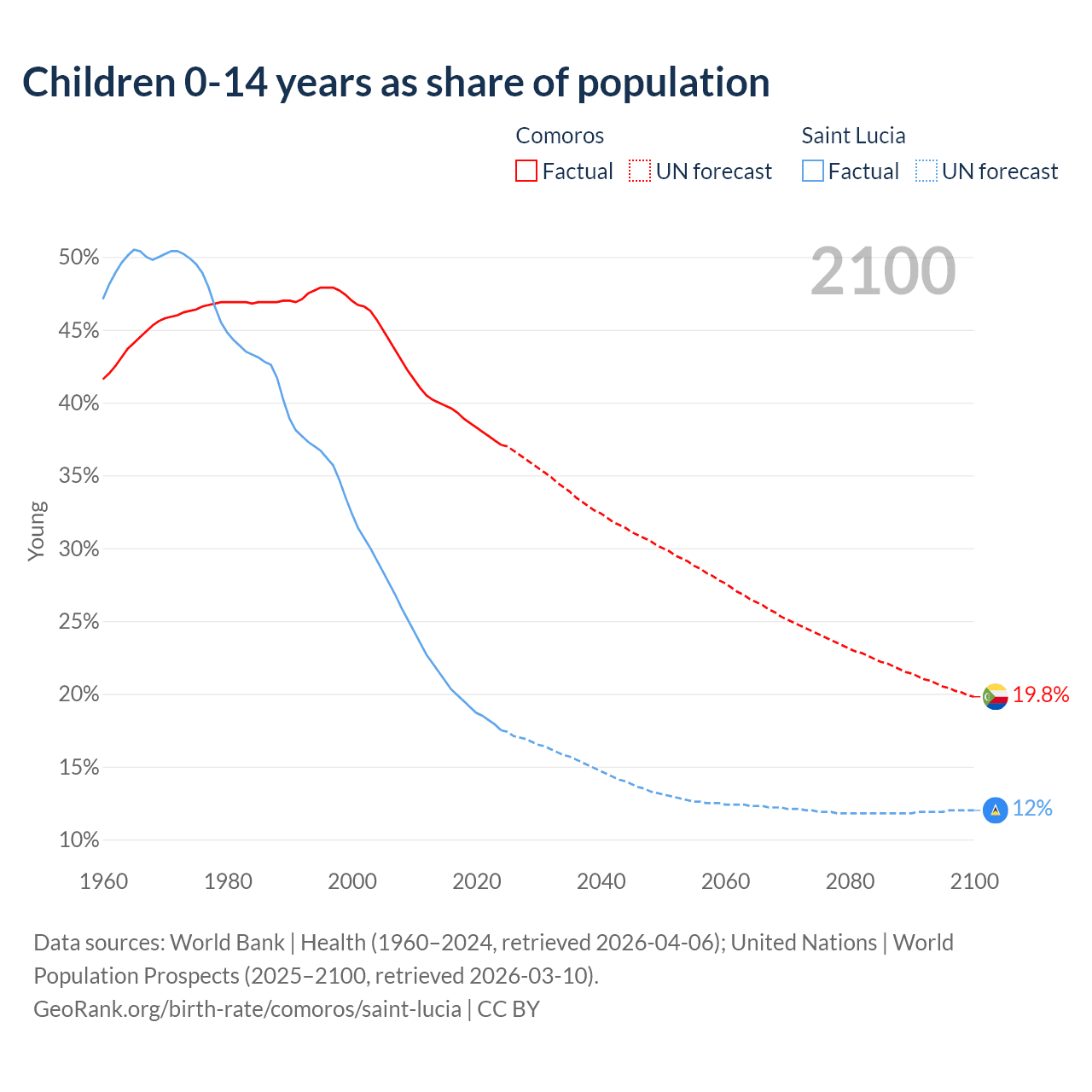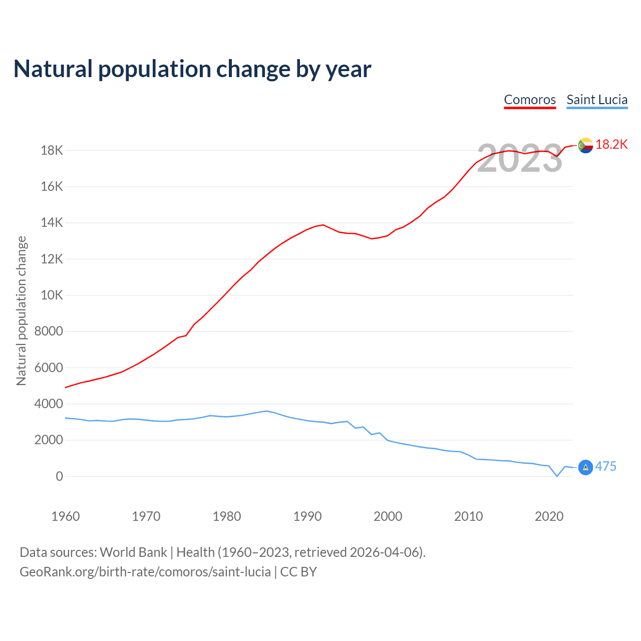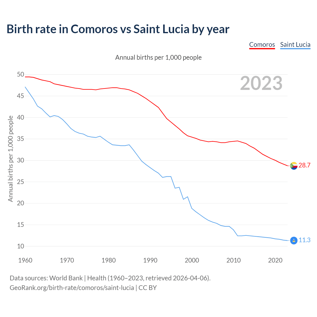 Comoros has an annual birth rate of 28.7 births per 1,000 people, compared to 11.3 for Saint Lucia. The average number of children a woman is expected to have during her lifetime — the fertility rate, is 3.88 in Comoros and 1.38 in Saint Lucia — 64.4% difference.