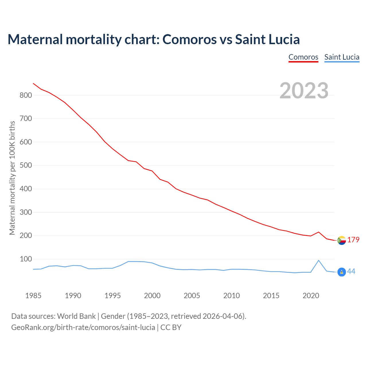 The maternal mortality rate, which is the probability of dying during childbirth or within 42 days of pregnancy termination, is 179 deaths per 100,000 live births in Comoros, compared to 44 deaths in Saint Lucia.