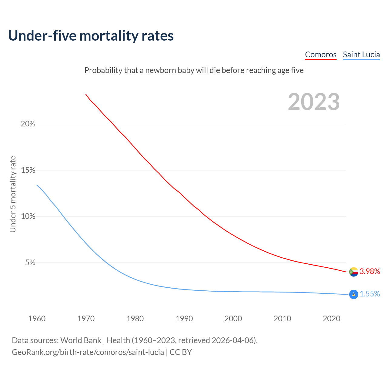 The chance that a newborn baby will die before reaching age five is 3.98% in Comoros and 1.55% in Saint Lucia. Above is a chart with historical data on under-five mortality rates.