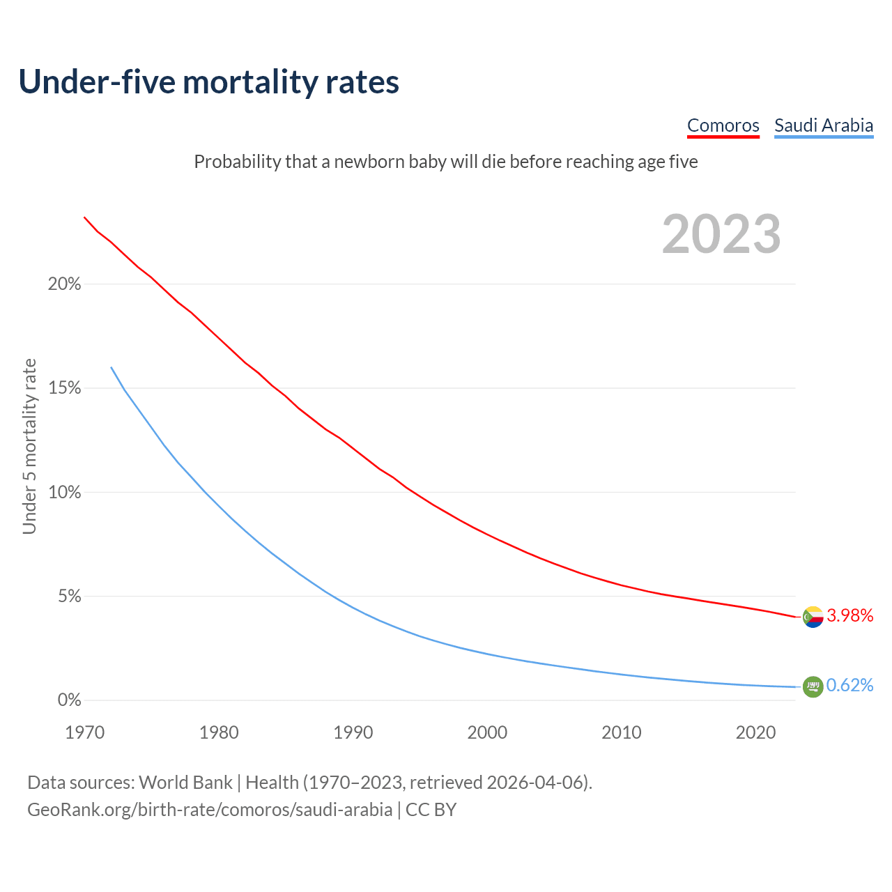 The chance that a newborn baby will die before reaching age five is 3.98% in Comoros and 0.62% in Saudi Arabia. Above is a chart with historical data on under-five mortality rates.