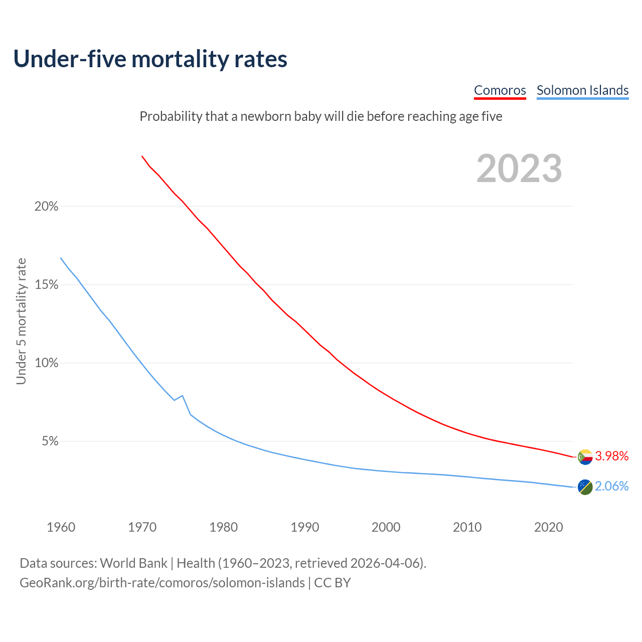 The chance that a newborn baby will die before reaching age five is 3.98% in Comoros and 2.06% in the Solomon Islands. Above is a chart with historical data on under-five mortality rates.