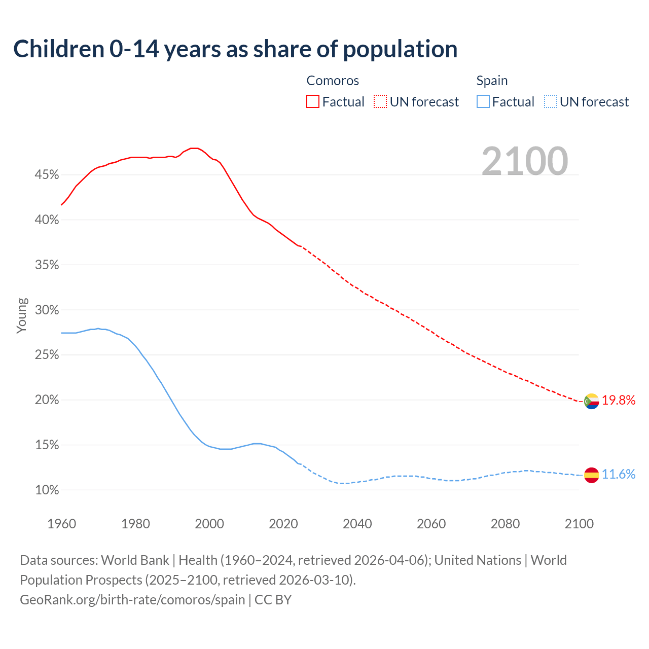 Comoros has an annual birth rate of 28.7 births per 1,000 people, compared to 6.7 for Spain. The average number of children a woman is expected to have during her lifetime — the fertility rate, is 3.88 in Comoros and 1.12 in Spain — 71.1% difference.