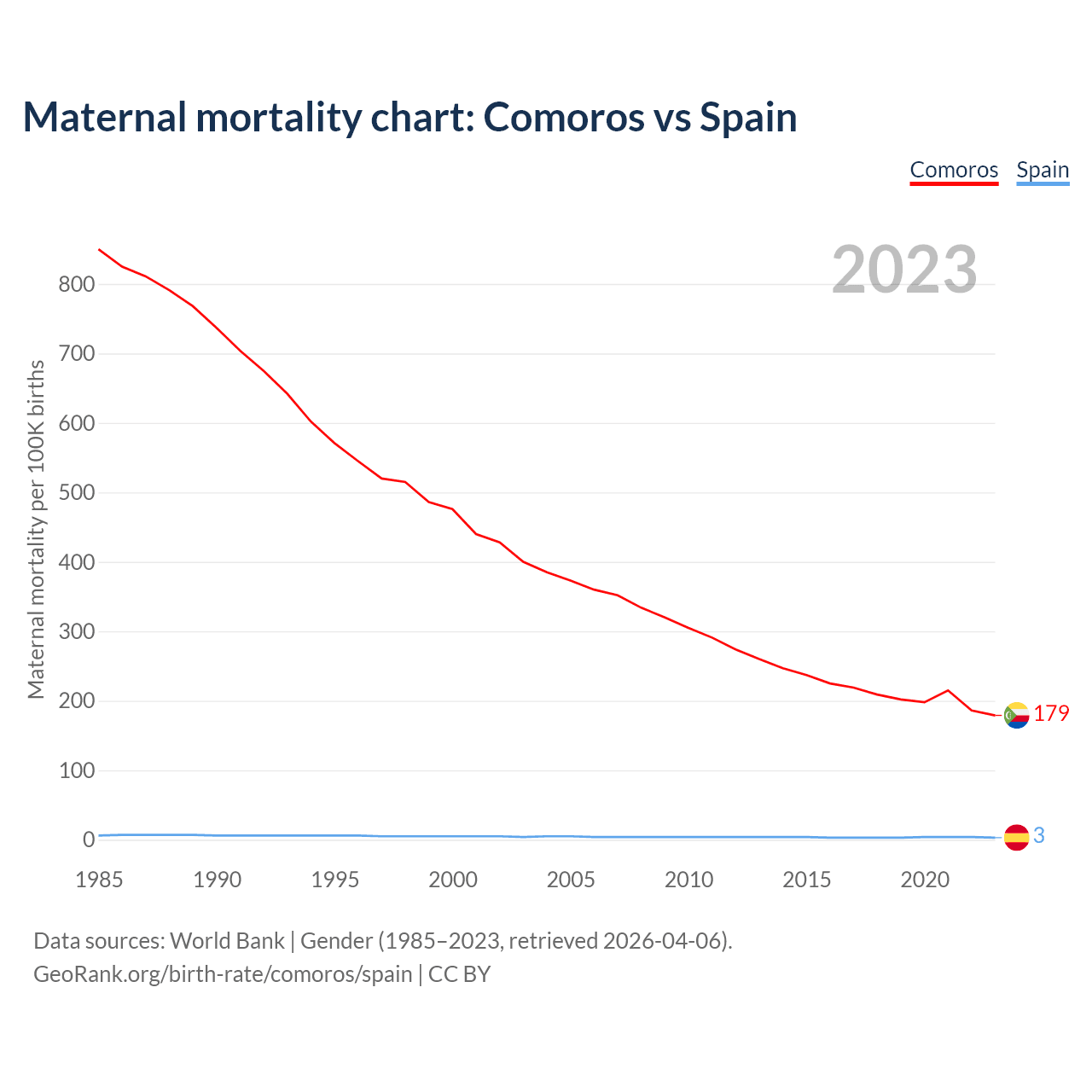 The maternal mortality rate, which is the probability of dying during childbirth or within 42 days of pregnancy termination, is 179 deaths per 100,000 live births in Comoros, compared to 3 deaths in Spain.