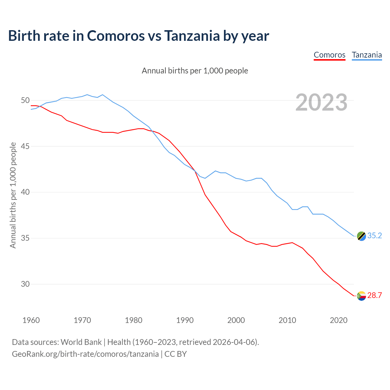 Comoros has an annual birth rate of 28.7 births per 1,000 people, compared to 35.2 for Tanzania. The average number of children a woman is expected to have during her lifetime — the fertility rate, is 3.88 in Comoros and 4.61 in Tanzania — 18.8% difference.