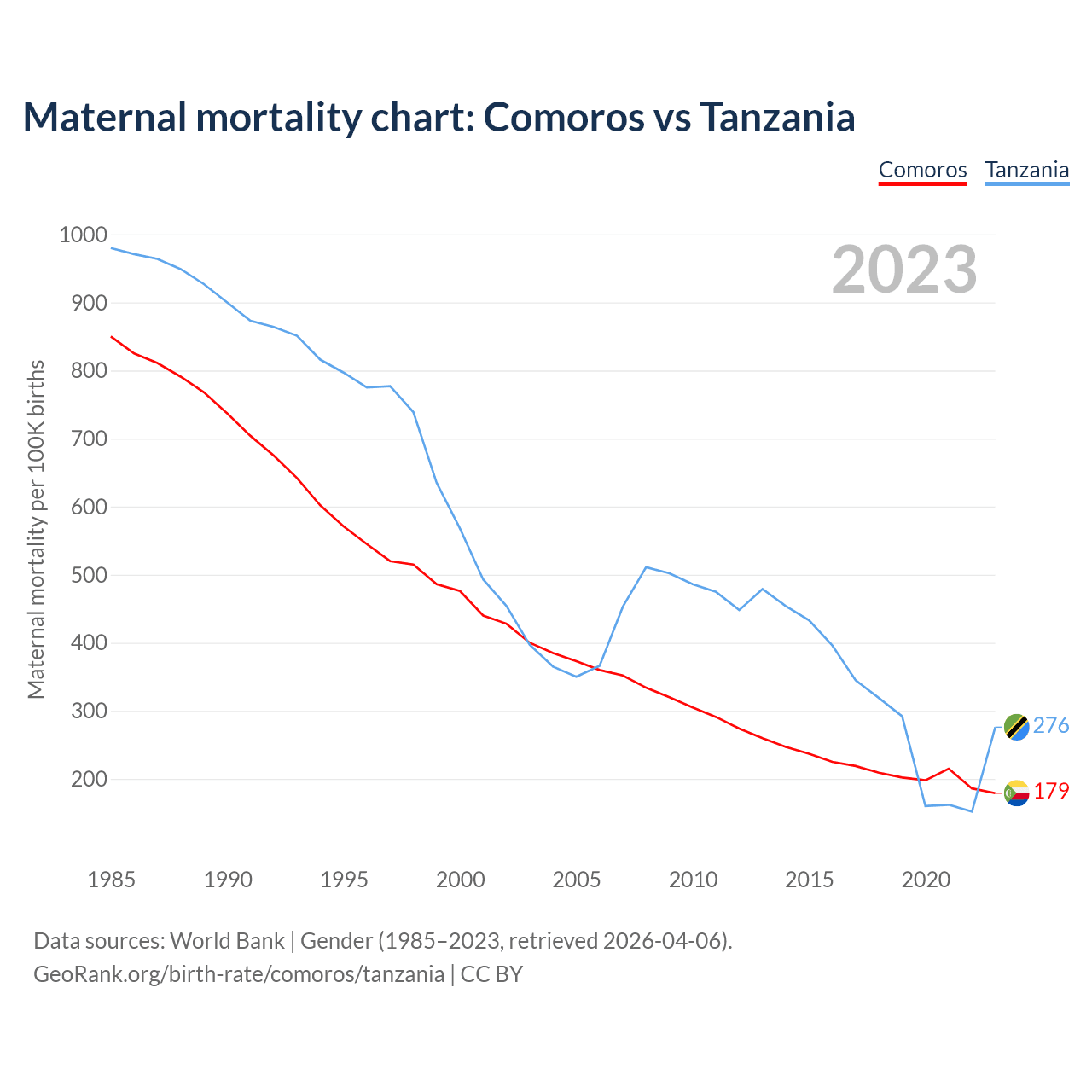 The maternal mortality rate, which is the probability of dying during childbirth or within 42 days of pregnancy termination, is 179 deaths per 100,000 live births in Comoros, compared to 276 deaths in Tanzania.