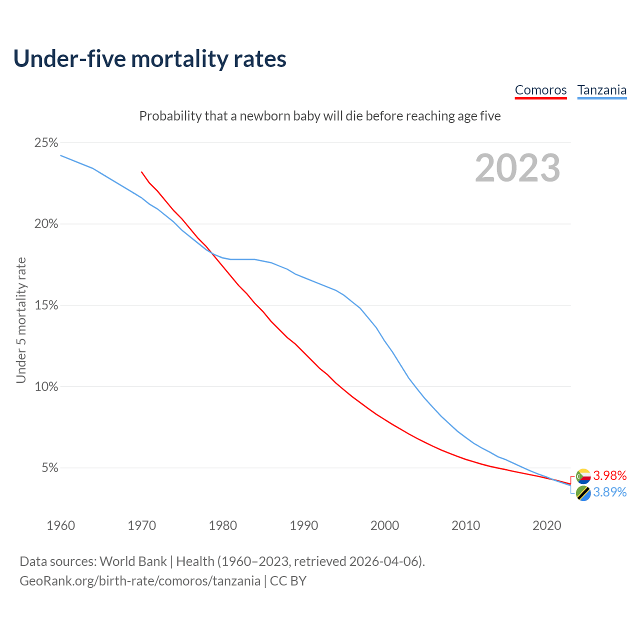 The chance that a newborn baby will die before reaching age five is 3.98% in Comoros and 3.89% in Tanzania. Above is a chart with historical data on under-five mortality rates.