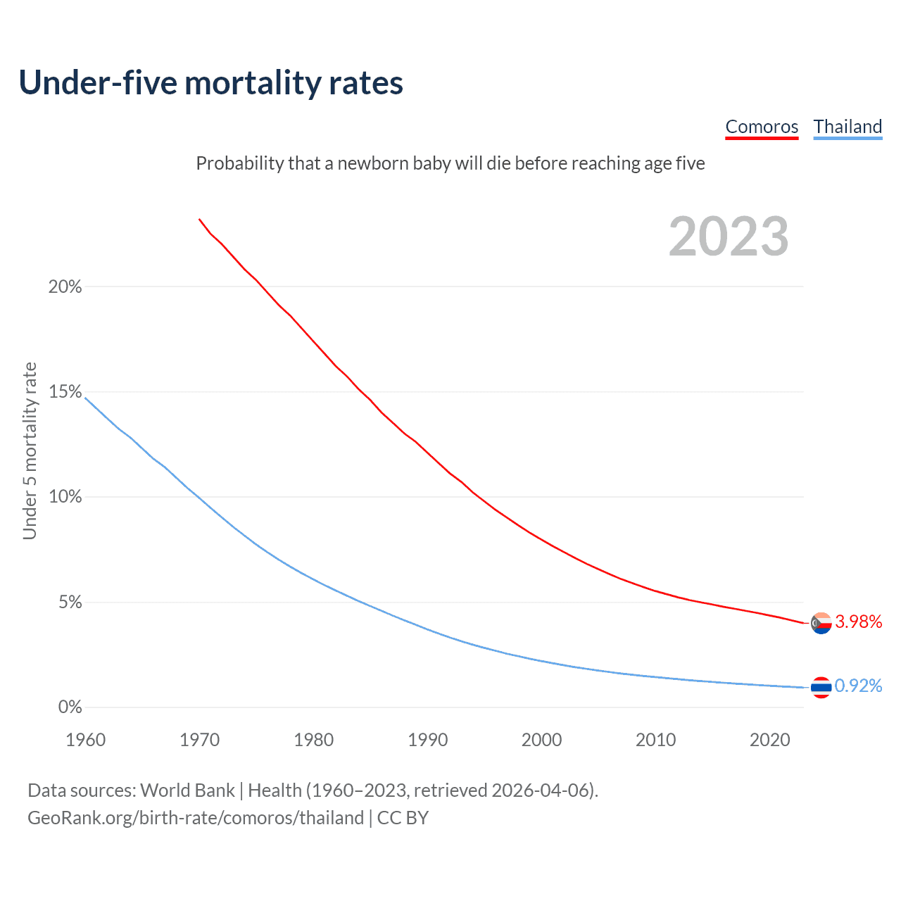 The chance that a newborn baby will die before reaching age five is 3.98% in Comoros and 0.92% in Thailand. Above is a chart with historical data on under-five mortality rates.