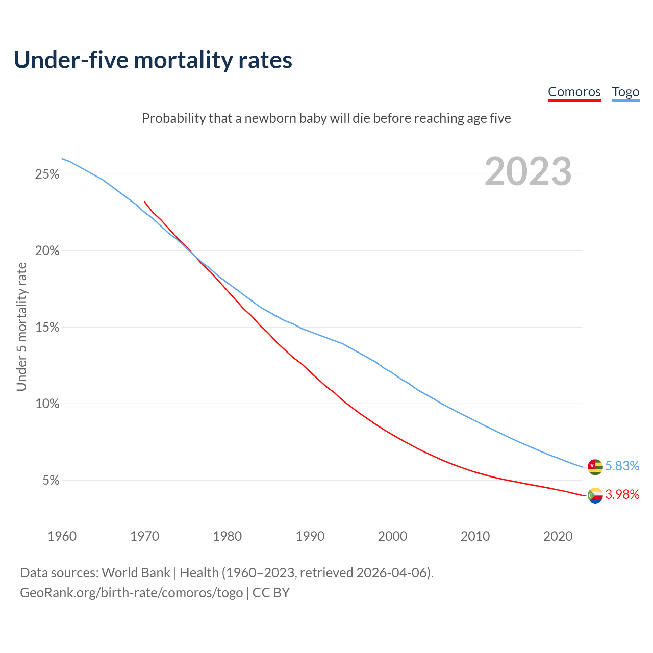 The chance that a newborn baby will die before reaching age five is 3.98% in Comoros and 5.83% in Togo. Above is a chart with historical data on under-five mortality rates.