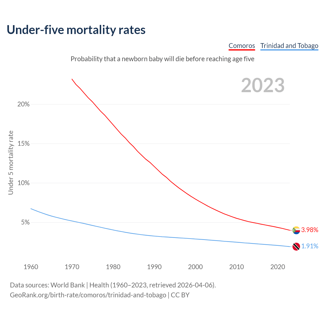 The chance that a newborn baby will die before reaching age five is 3.98% in Comoros and 1.91% in Trinidad and Tobago. Above is a chart with historical data on under-five mortality rates.