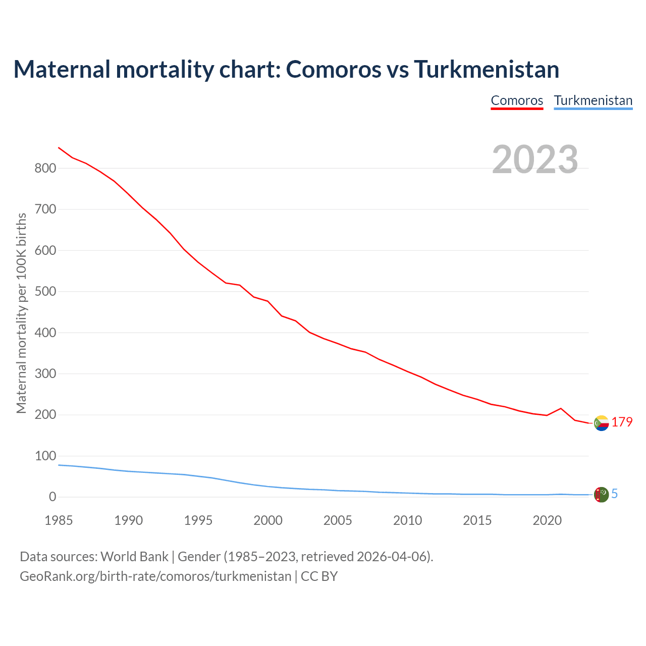 The maternal mortality rate, which is the probability of dying during childbirth or within 42 days of pregnancy termination, is 179 deaths per 100,000 live births in Comoros, compared to 5 deaths in Turkmenistan.