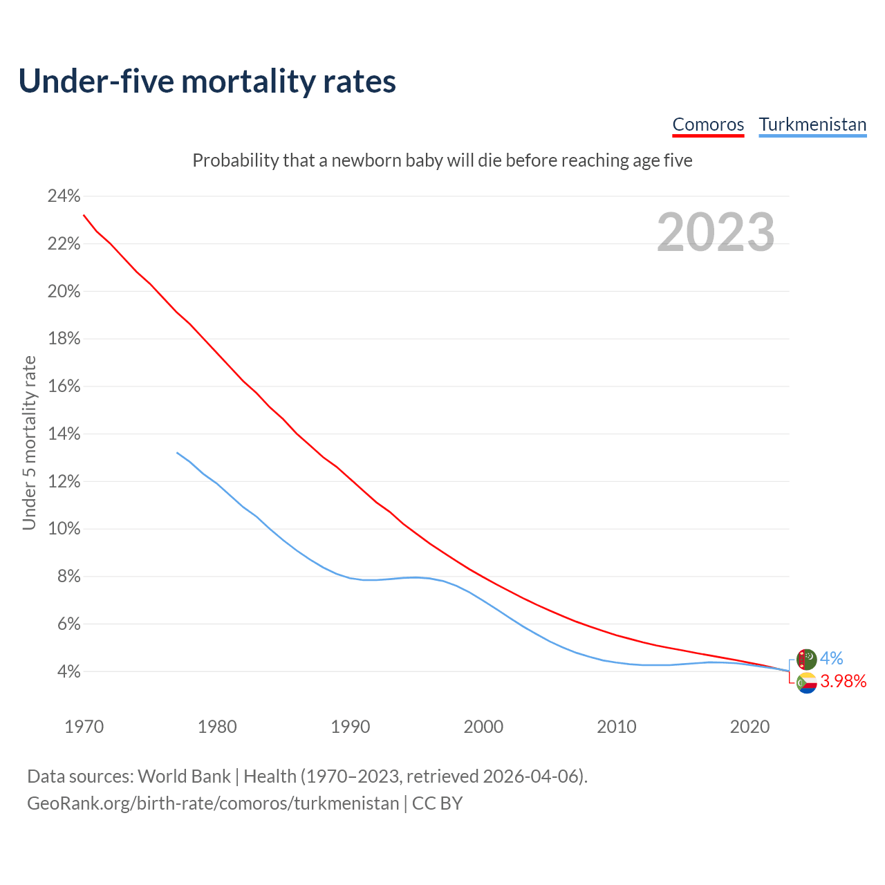 The chance that a newborn baby will die before reaching age five is 3.98% in Comoros and 4% in Turkmenistan. Above is a chart with historical data on under-five mortality rates.