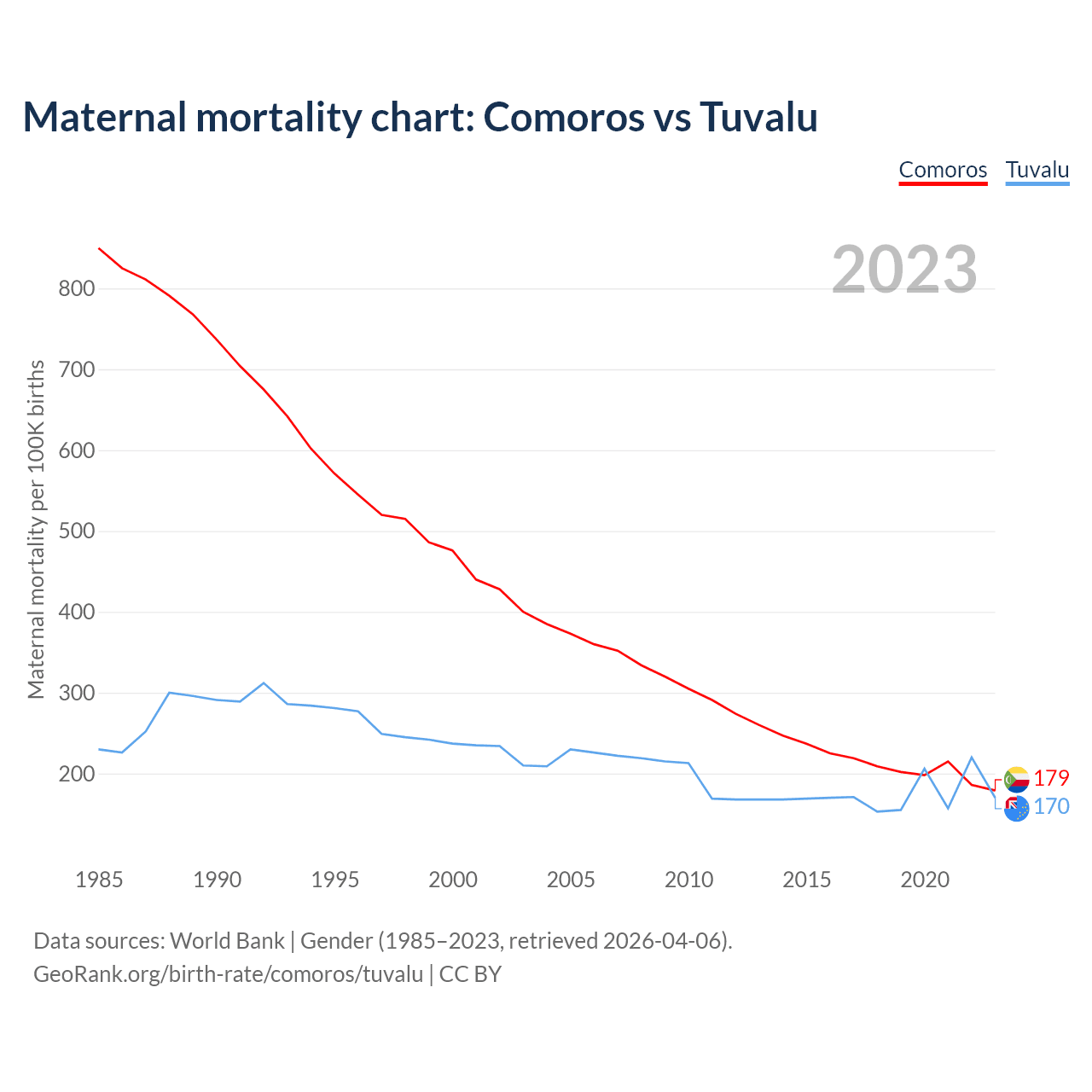 The maternal mortality rate, which is the probability of dying during childbirth or within 42 days of pregnancy termination, is 179 deaths per 100,000 live births in Comoros, compared to 170 deaths in Tuvalu.