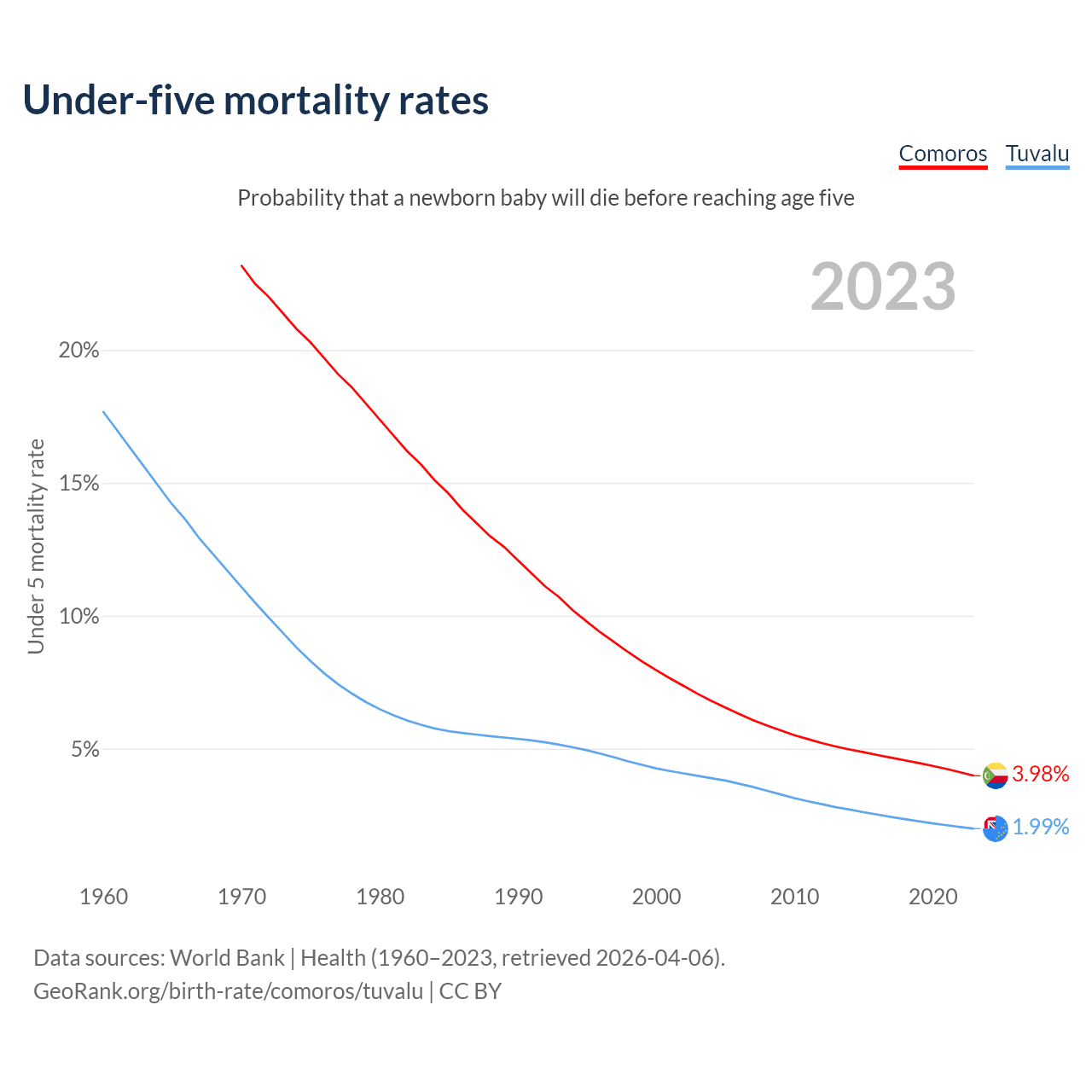 The chance that a newborn baby will die before reaching age five is 3.98% in Comoros and 1.99% in Tuvalu. Above is a chart with historical data on under-five mortality rates.