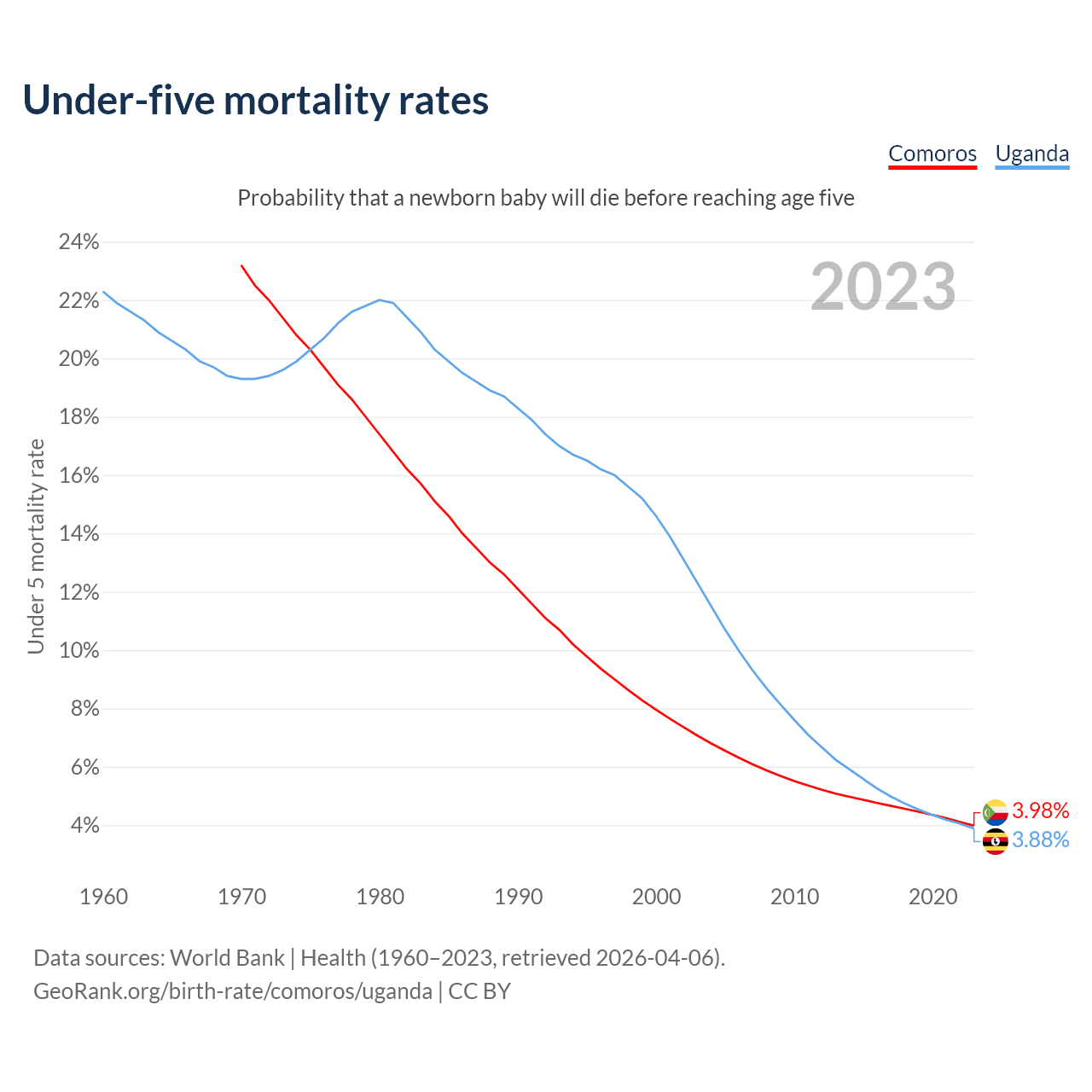 The chance that a newborn baby will die before reaching age five is 3.98% in Comoros and 3.88% in Uganda. Above is a chart with historical data on under-five mortality rates.