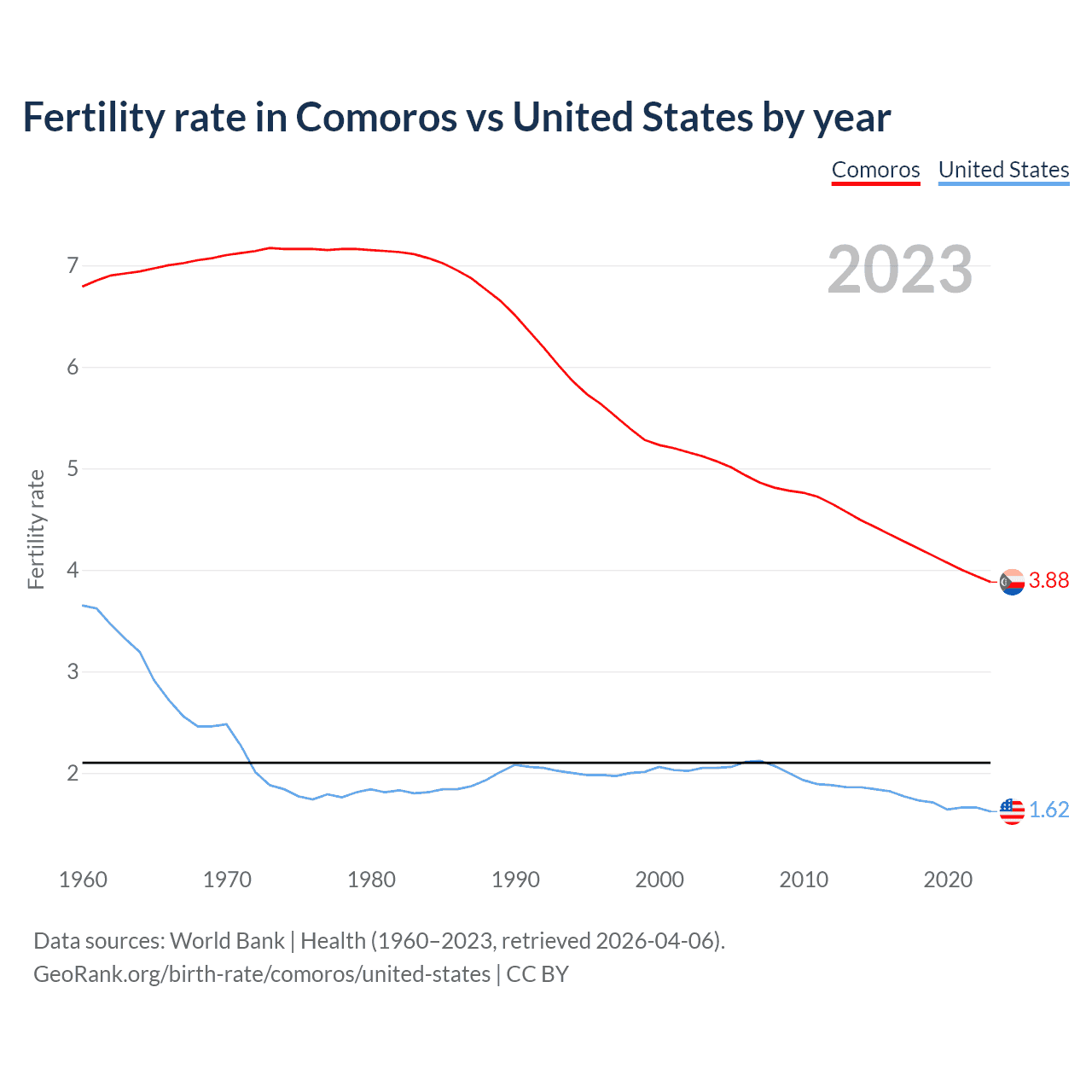 1960 vs 2023, the fertility rate has decreased by 42.9% in Comoros and by 55.8% in the United States — in 1960, it was 6.79 and 3.65, respectively.