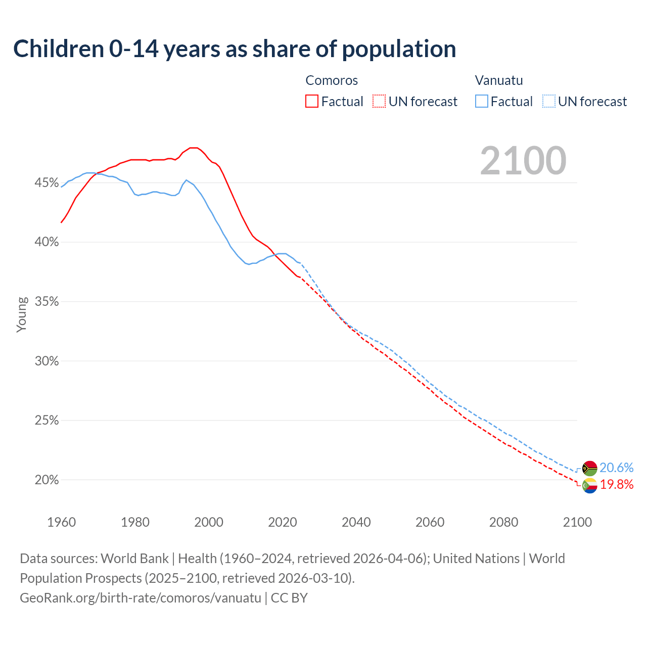 1960 vs 2023, the fertility rate has decreased by 42.9% in Comoros and by 47% in Vanuatu — in 1960, it was 6.79 and 6.78, respectively.