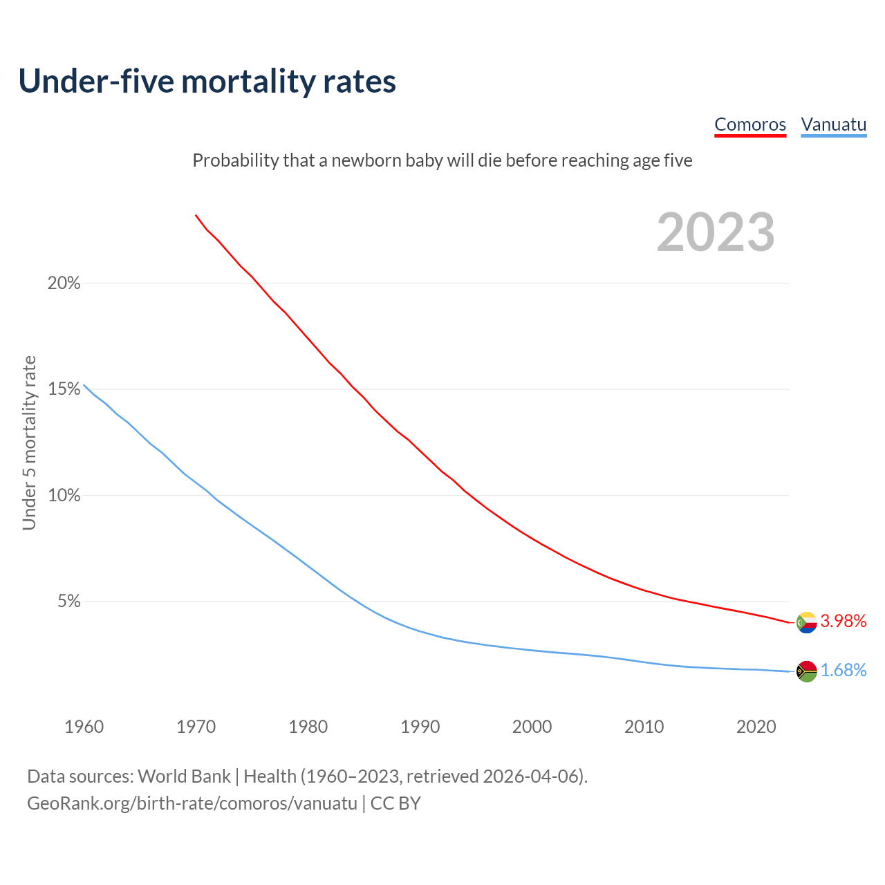 The chance that a newborn baby will die before reaching age five is 3.98% in Comoros and 1.68% in Vanuatu. Above is a chart with historical data on under-five mortality rates.
