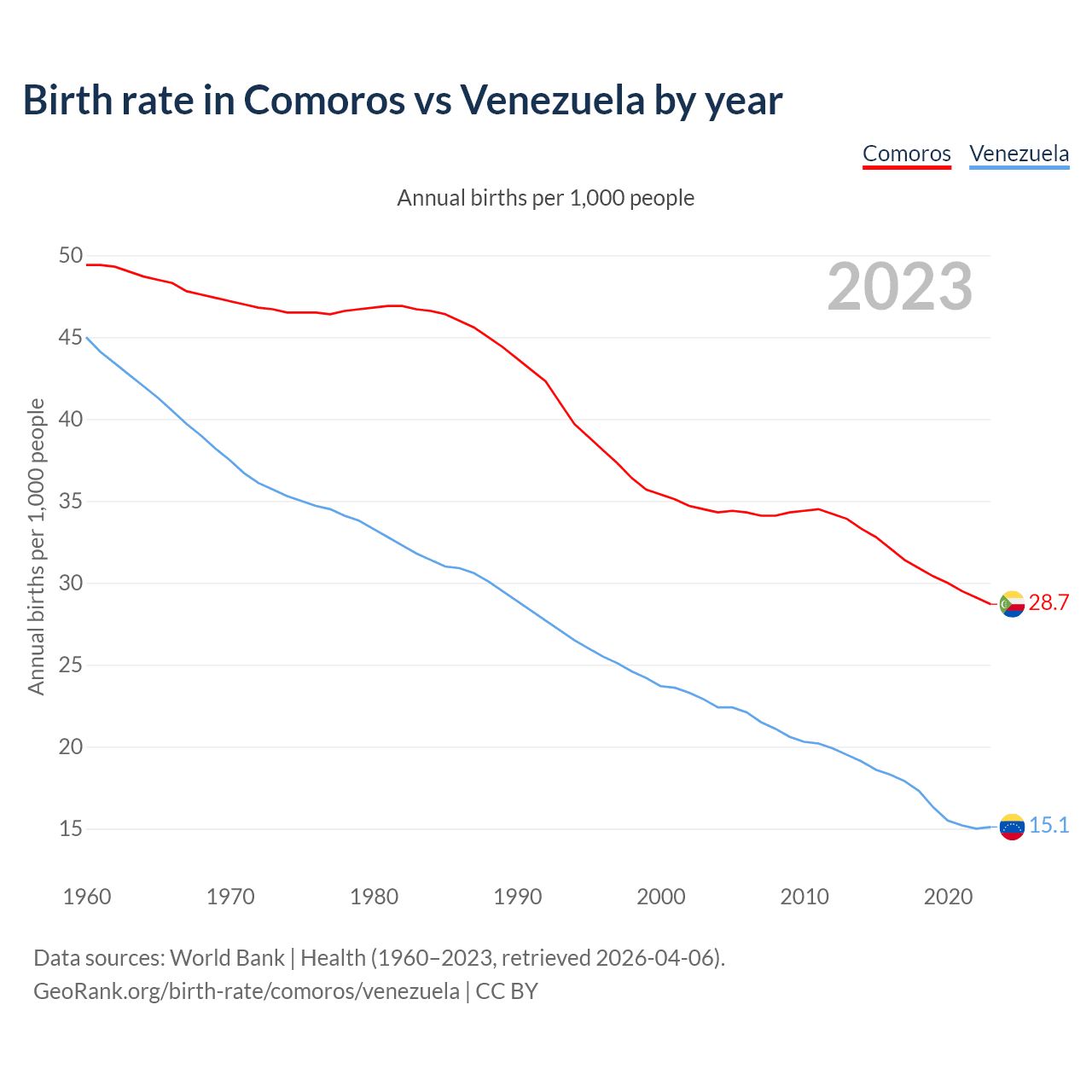 Comoros has an annual birth rate of 28.7 births per 1,000 people, compared to 15.1 for Venezuela. The average number of children a woman is expected to have during her lifetime — the fertility rate, is 3.88 in Comoros and 2.08 in Venezuela — 46.4% difference.