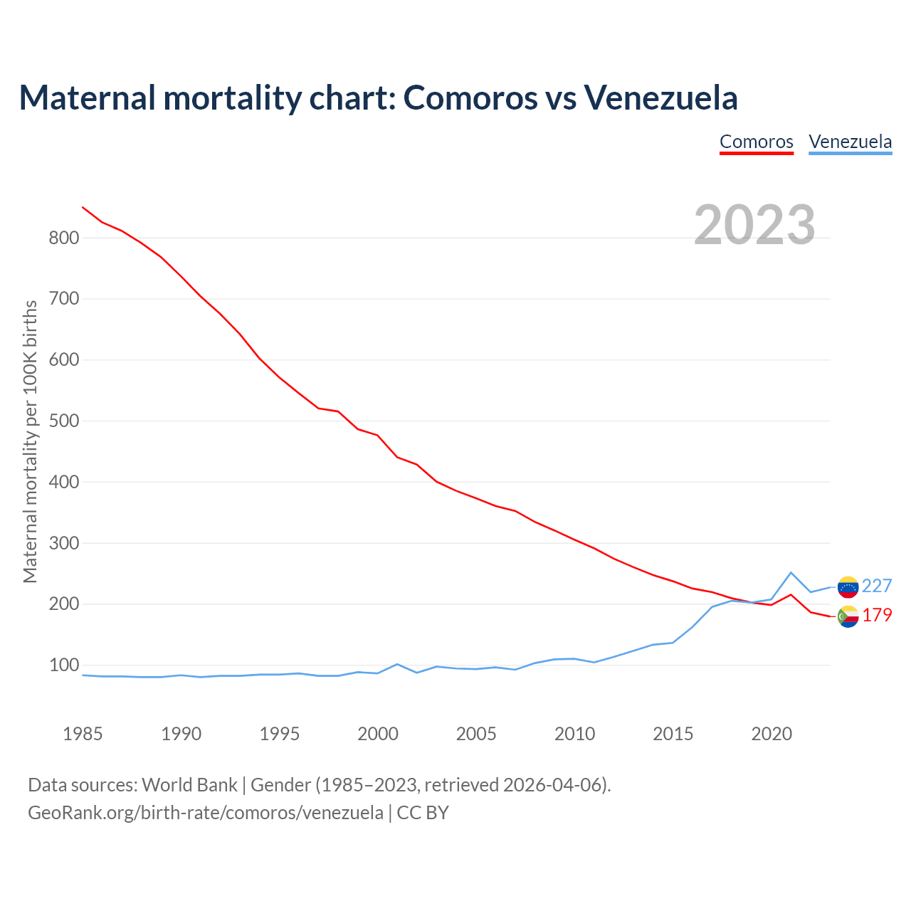 The maternal mortality rate, which is the probability of dying during childbirth or within 42 days of pregnancy termination, is 179 deaths per 100,000 live births in Comoros, compared to 227 deaths in Venezuela.