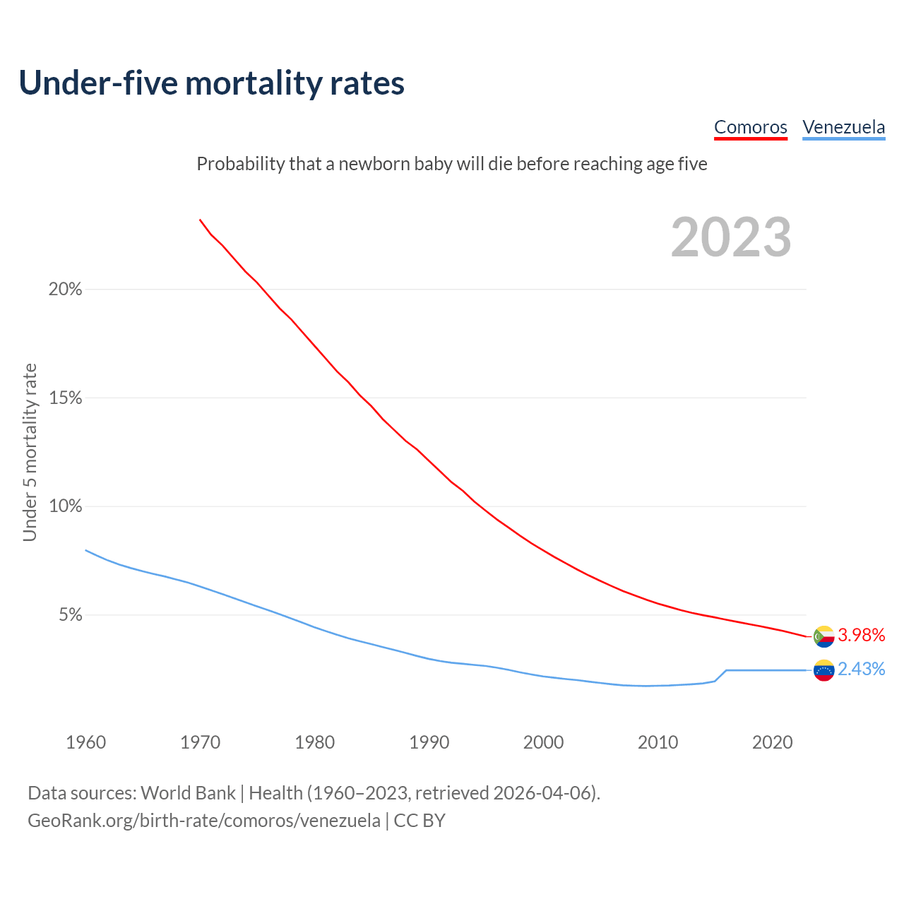 The chance that a newborn baby will die before reaching age five is 3.98% in Comoros and 2.43% in Venezuela. Above is a chart with historical data on under-five mortality rates.