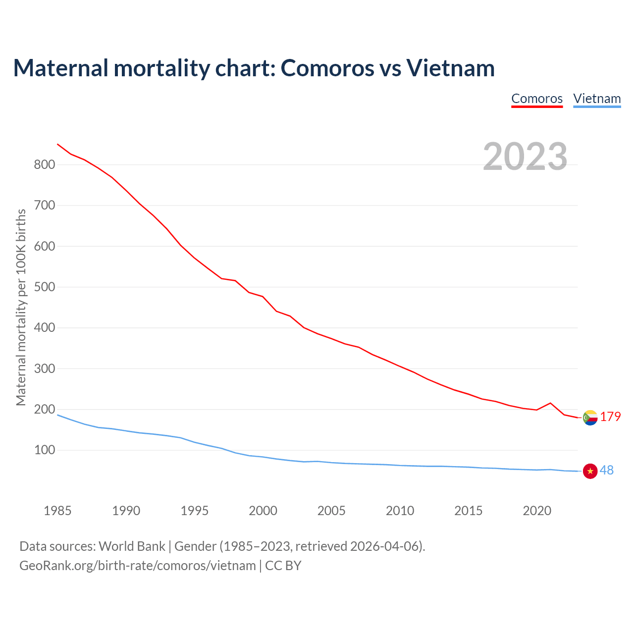 The maternal mortality rate, which is the probability of dying during childbirth or within 42 days of pregnancy termination, is 179 deaths per 100,000 live births in Comoros, compared to 48 deaths in Vietnam.