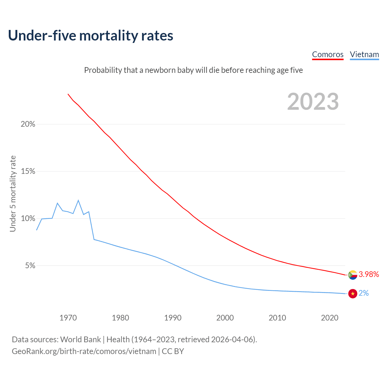 The chance that a newborn baby will die before reaching age five is 3.98% in Comoros and 2% in Vietnam. Above is a chart with historical data on under-five mortality rates.
