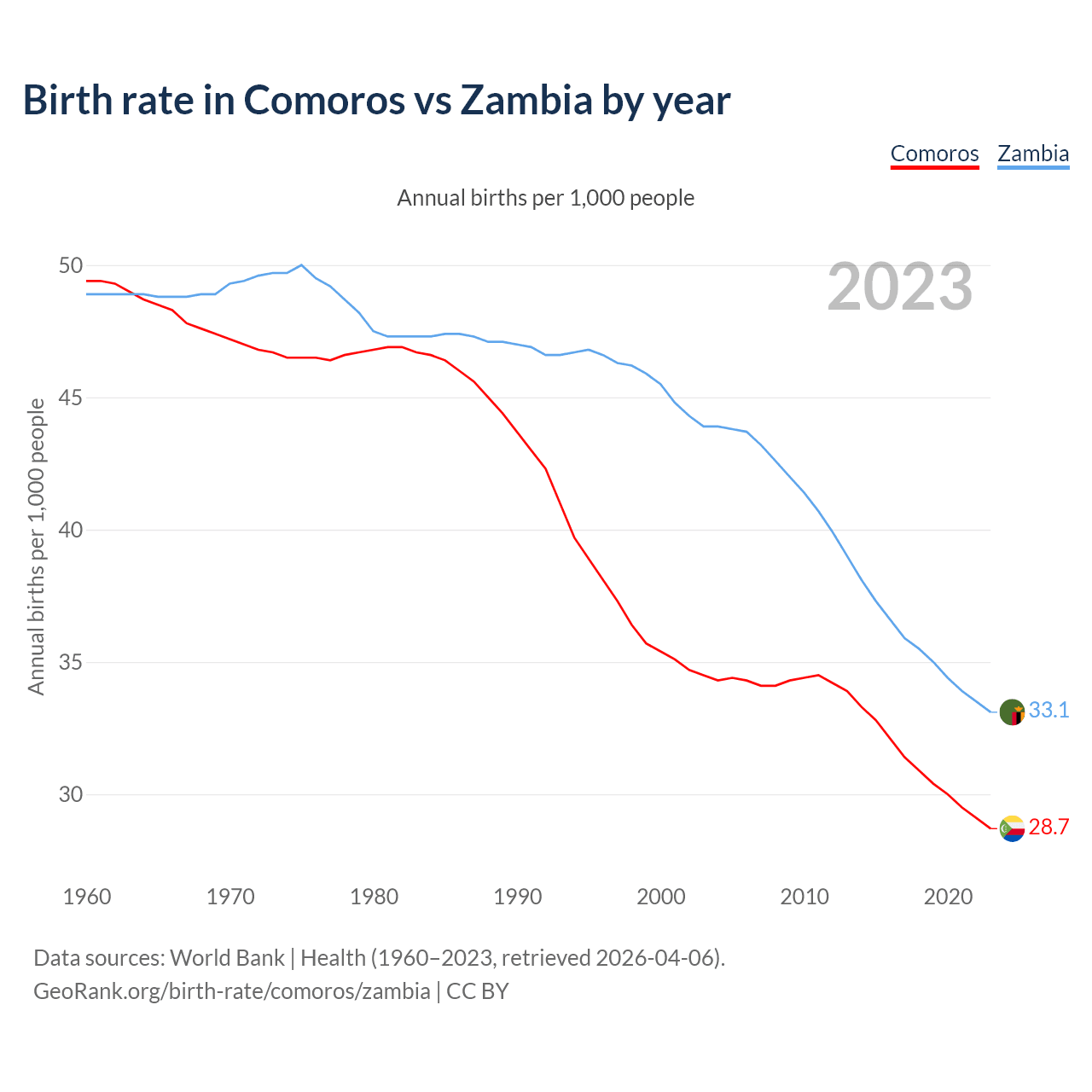 Comoros has an annual birth rate of 28.7 births per 1,000 people, compared to 33.1 for Zambia. The average number of children a woman is expected to have during her lifetime — the fertility rate, is 3.88 in Comoros and 4.1 in Zambia — 5.75% difference.