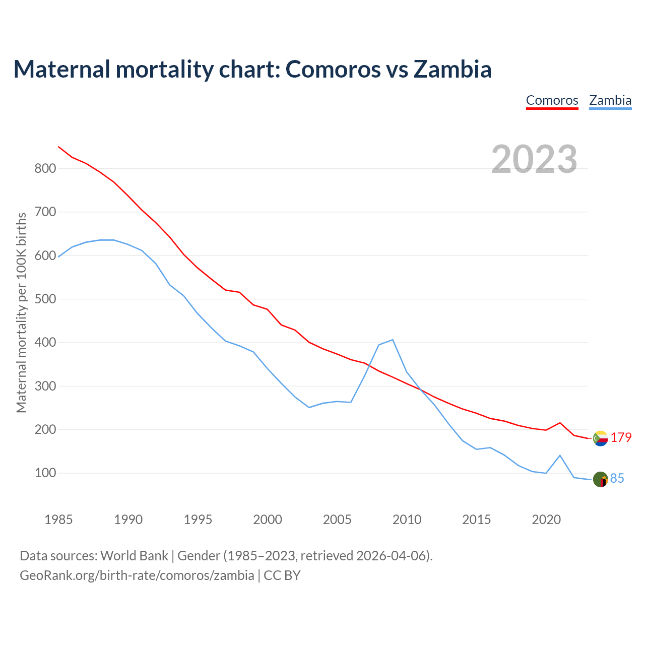 The maternal mortality rate, which is the probability of dying during childbirth or within 42 days of pregnancy termination, is 179 deaths per 100,000 live births in Comoros, compared to 85 deaths in Zambia.