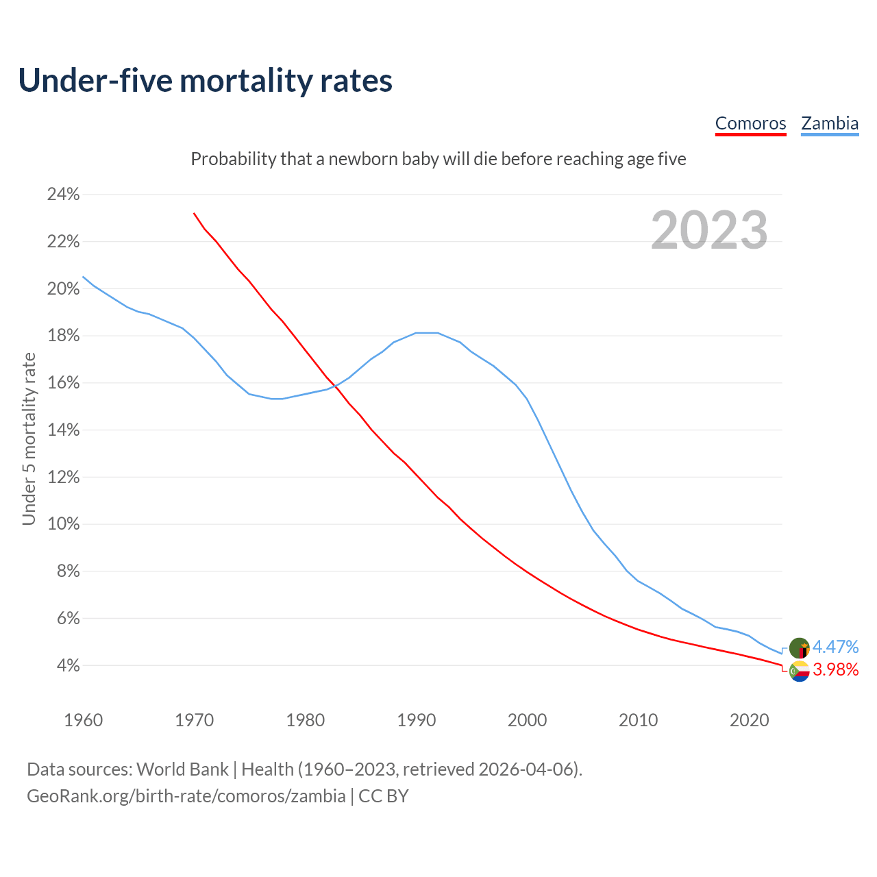 The chance that a newborn baby will die before reaching age five is 3.98% in Comoros and 4.47% in Zambia. Above is a chart with historical data on under-five mortality rates.