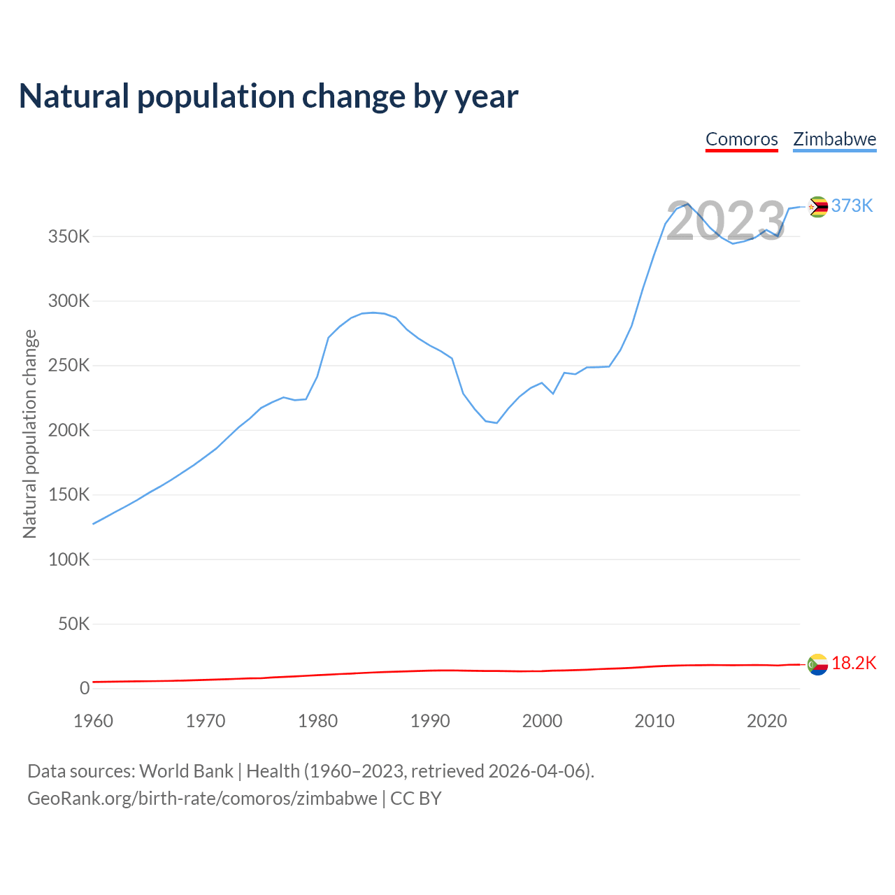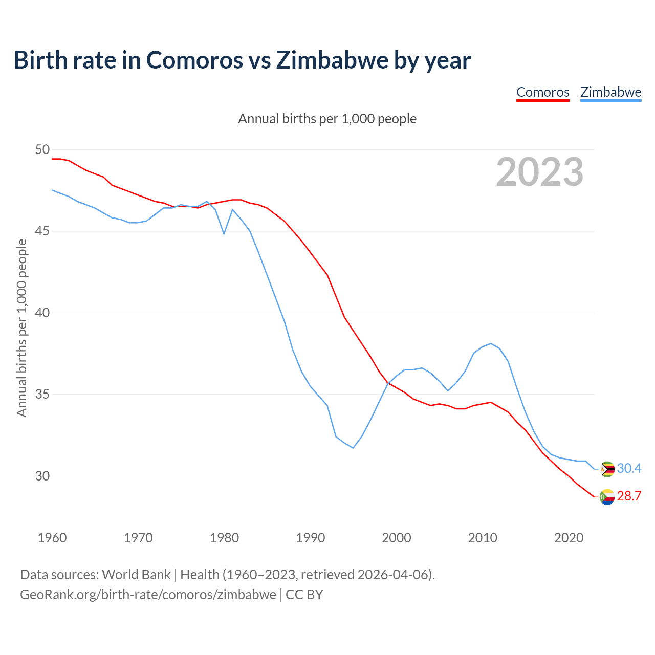 Comoros has an annual birth rate of 28.7 births per 1,000 people, compared to 30.4 for Zimbabwe. The average number of children a woman is expected to have during her lifetime — the fertility rate, is 3.88 in Comoros and 3.72 in Zimbabwe — 3.97% difference.
