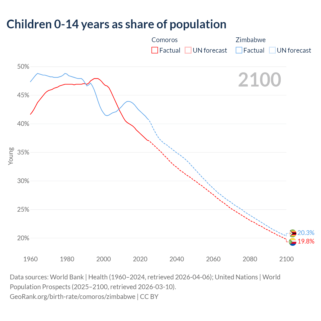 1960 vs 2023, the fertility rate has decreased by 42.9% in Comoros and by 48.2% in Zimbabwe — in 1960, it was 6.79 and 7.2, respectively.