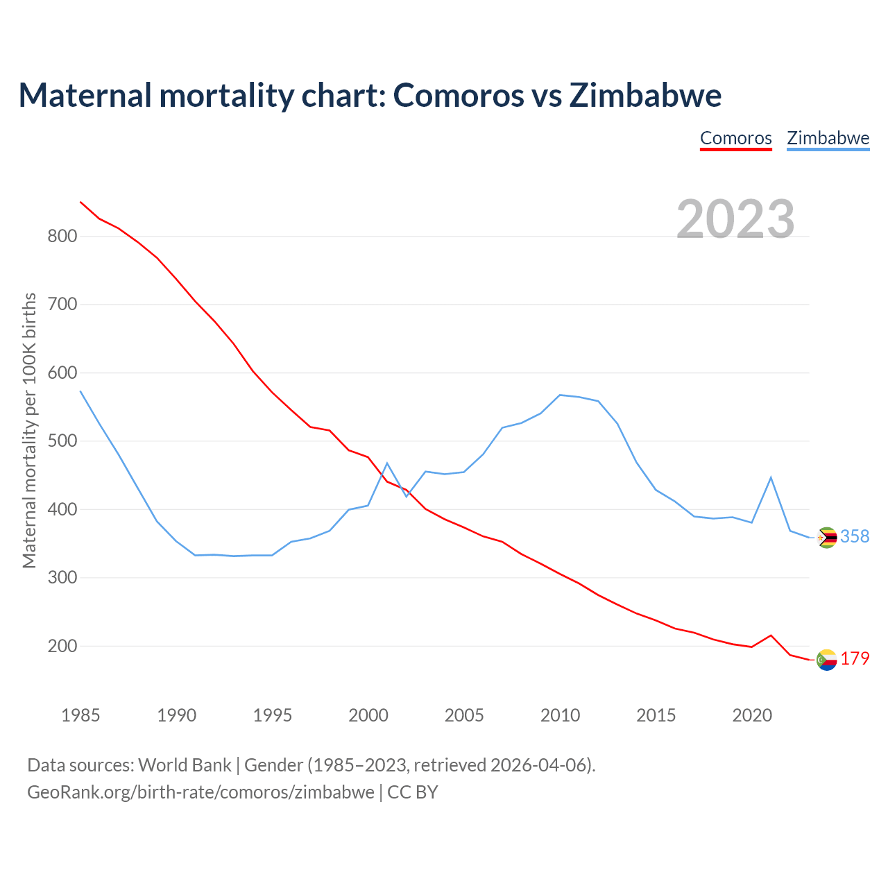 The maternal mortality rate, which is the probability of dying during childbirth or within 42 days of pregnancy termination, is 179 deaths per 100,000 live births in Comoros, compared to 358 deaths in Zimbabwe.