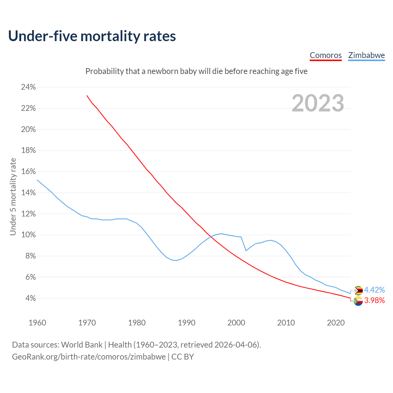 The chance that a newborn baby will die before reaching age five is 3.98% in Comoros and 4.42% in Zimbabwe. Above is a chart with historical data on under-five mortality rates.