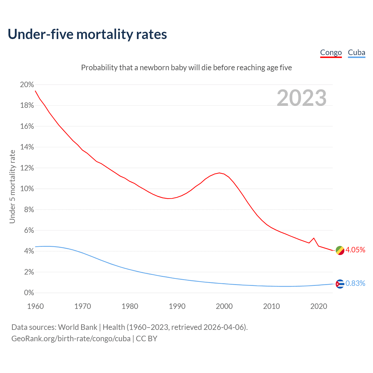 The chance that a newborn baby will die before reaching age five is 4.05% in the Congo and 0.83% in Cuba. Above is a chart with historical data on under-five mortality rates.