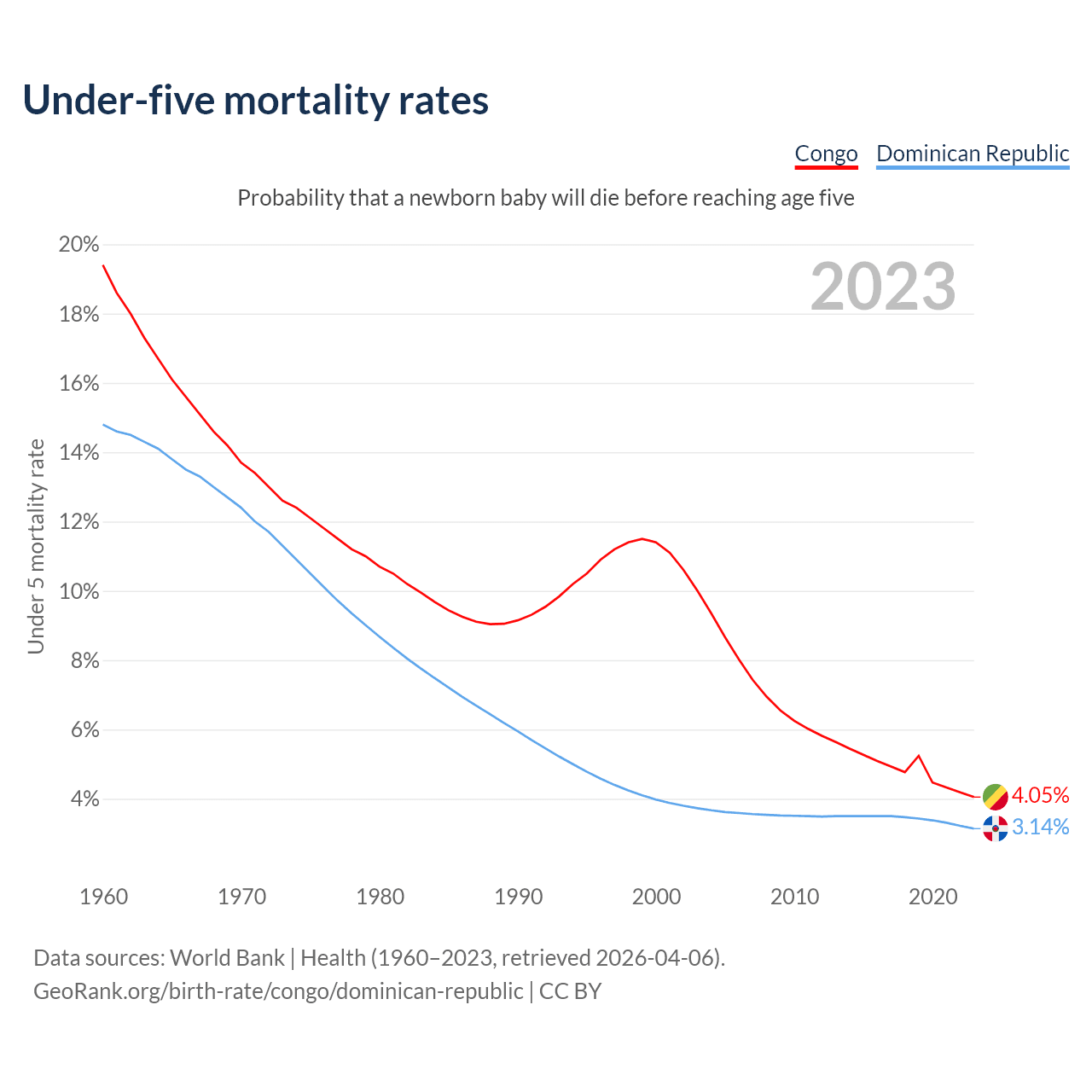 The chance that a newborn baby will die before reaching age five is 4.05% in the Congo and 3.14% in the Dominican Republic. Above is a chart with historical data on under-five mortality rates.