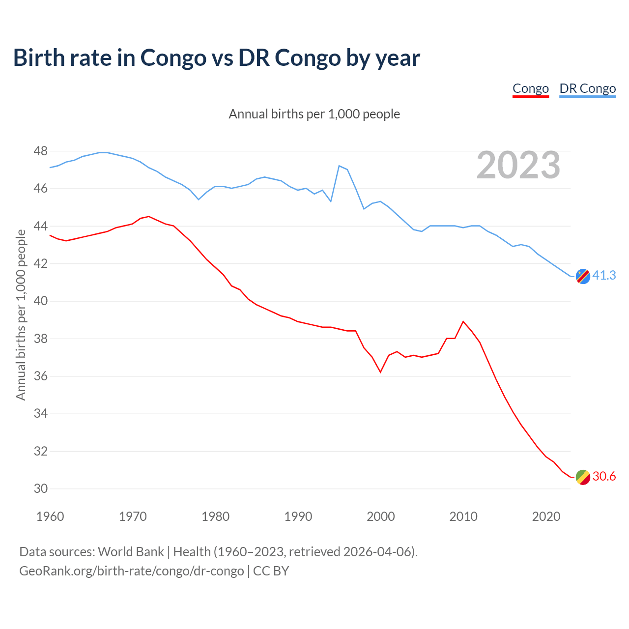 The Congo has an annual birth rate of 30.6 births per 1,000 people, compared to 41.3 for the DR Congo. The average number of children a woman is expected to have during her lifetime — the fertility rate, is 4.16 in the Congo and 6.05 in the DR Congo — 45.6% difference.